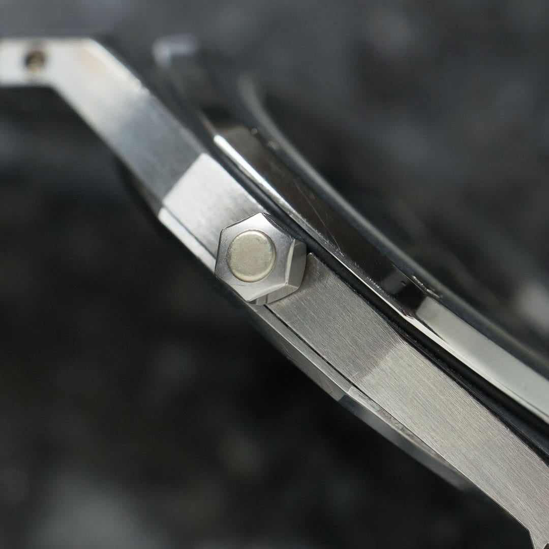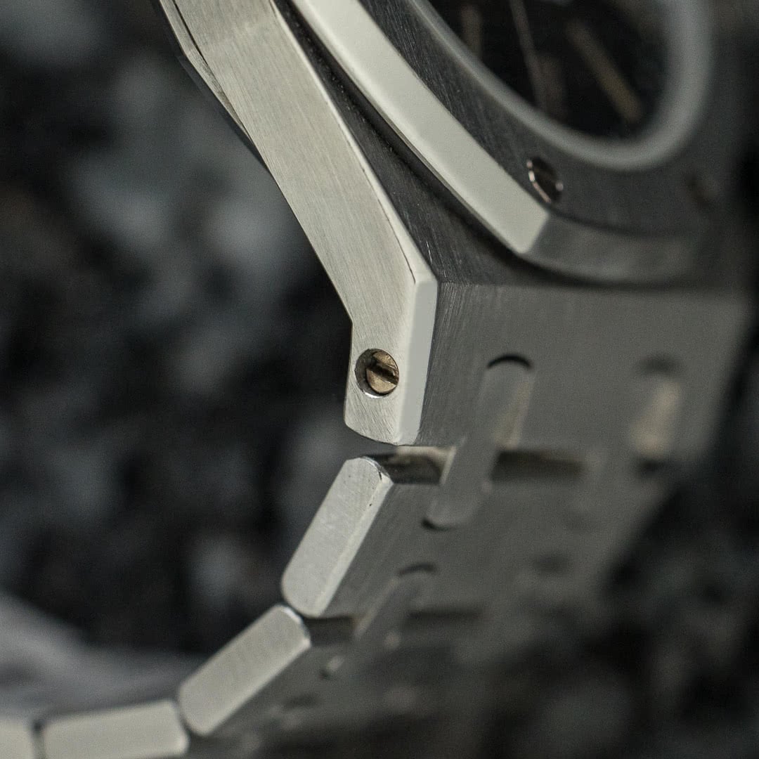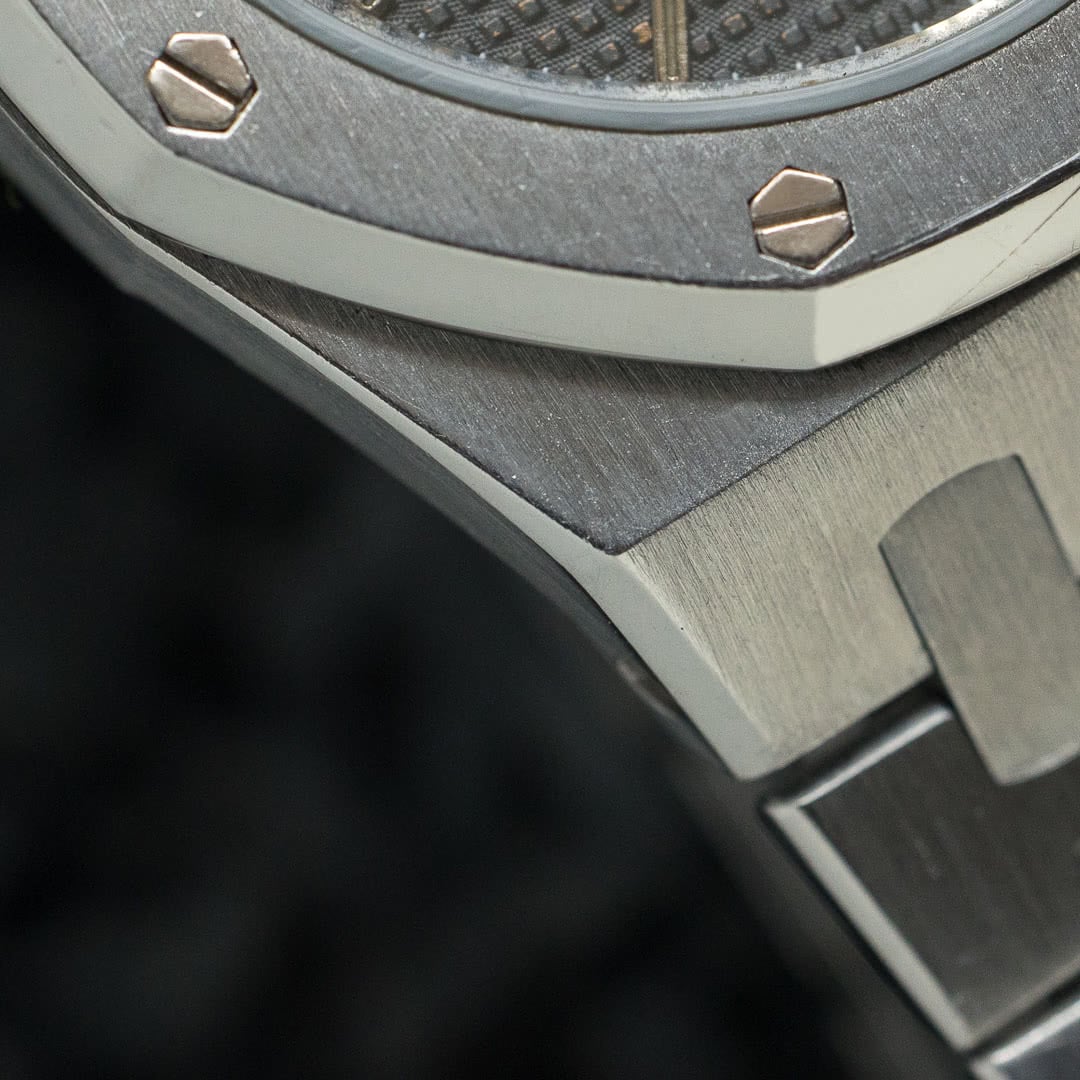 Designed in 1977 by Jacqueline Dimier, the Royal Oak reference 4100ST was the third Royal Oak produced in history, and the first ‘mid-size’ model, offering a smaller alternative to the reference 5402 which, with its 39 mm diameter, was considered a large watch for the time. It was in production for eight years, but were continuously sold until 2002. The 4100 is the largest series of all the so-called ‘mid-size’ Royal Oaks, with more than 8,400 units sold. In terms of design, purists will appreciate the ‘small font’ typography, as well as the proportions, which are an elegant mix between the first two references in history, the 5402 and the 8638. The 4100 also features a case back that separates from the case, a first at the time for the Royal Oak, which was still only designed in two parts.