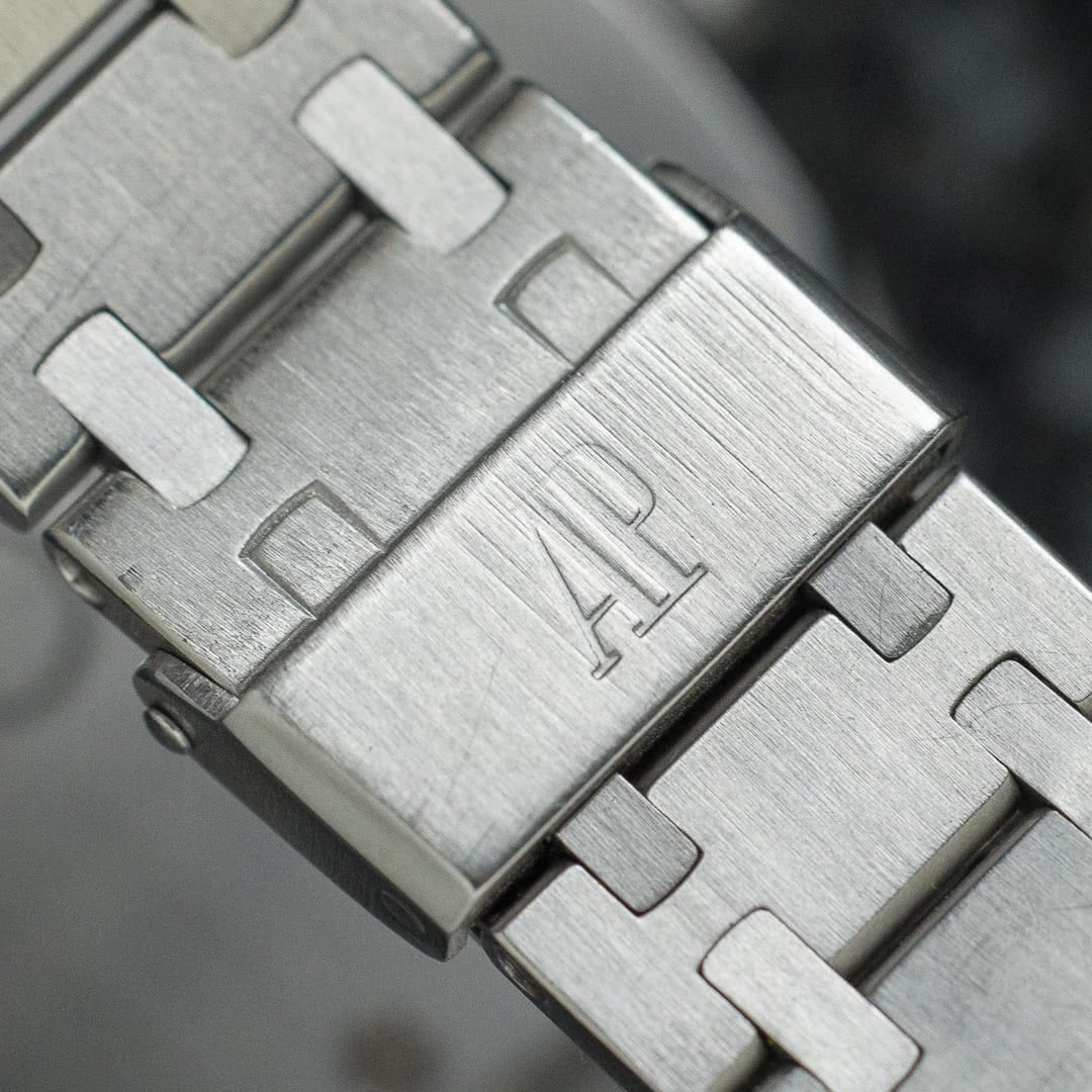 This particular watch has the original blue dial, which has beautifully tropicalised, acquiring a superb tint over time. All the parts are original, including the crown, which is not screwed down on the 4100 and was almost always replaced during servicing at Audemars Piguet. The case and bracelet are made of steel and have been kept in great condition. The calibre 2123 is the original calibre.