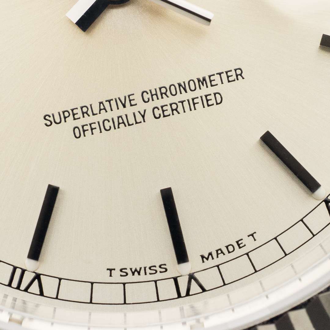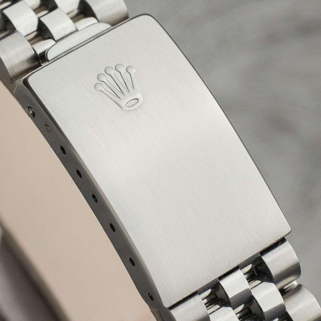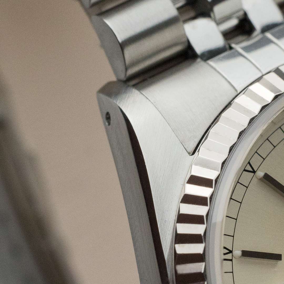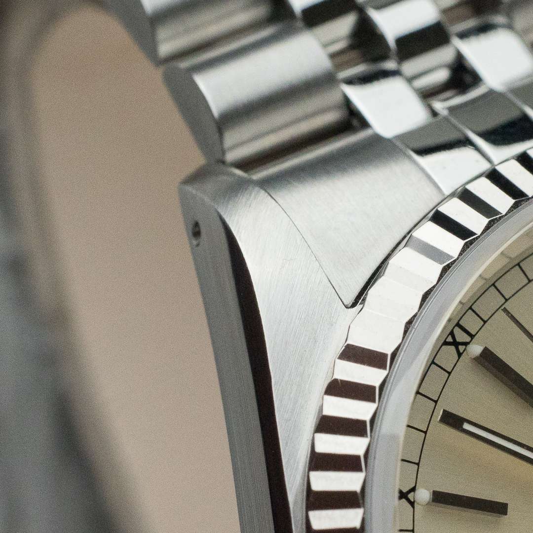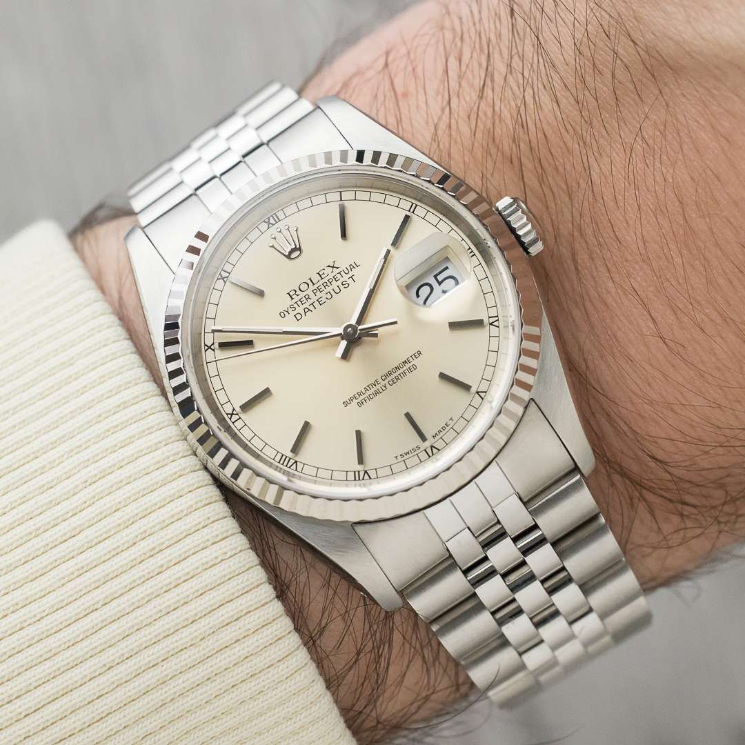 Cette pièce spécifique, avec son cadran argent, sa lunette cannelée en or blanc et son bracelet jubilé, reste probablement la version la plus connue et recherchée, grâce notamment à sa versatilité. Ce fascinant cadran a gagné une charmante patine vanille, et il varie de l’argent métallique au champagne clair en fonction de la lumière, ce qui lui confère une apparence vivante et dynamique au poignet. Les indexes et les aiguilles sont au tritium, ce dernier ayant gagné une charmante patine qui rajoute au côté vintage de la montre.