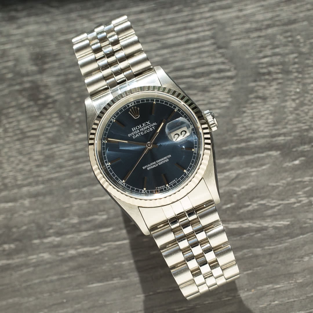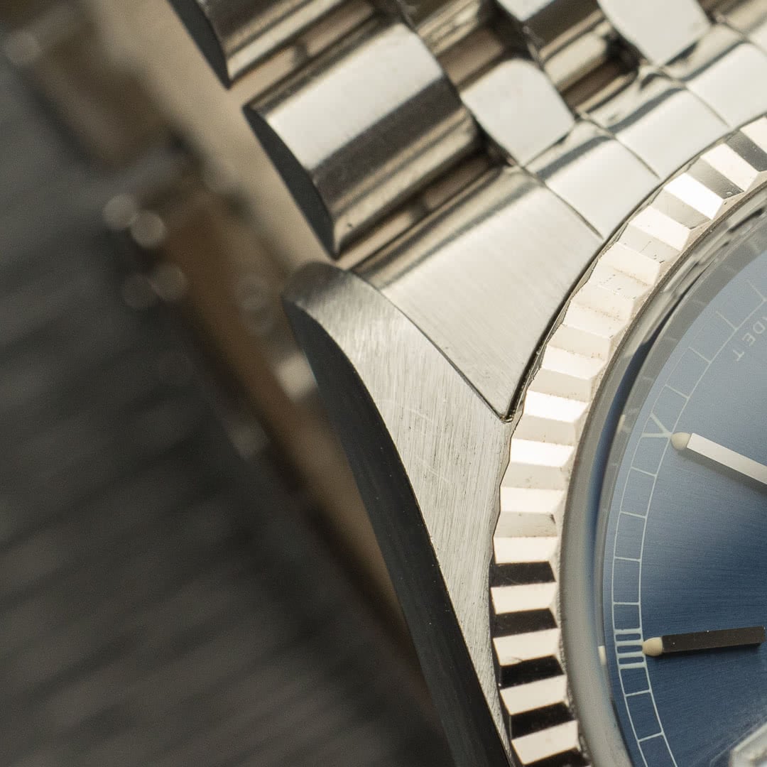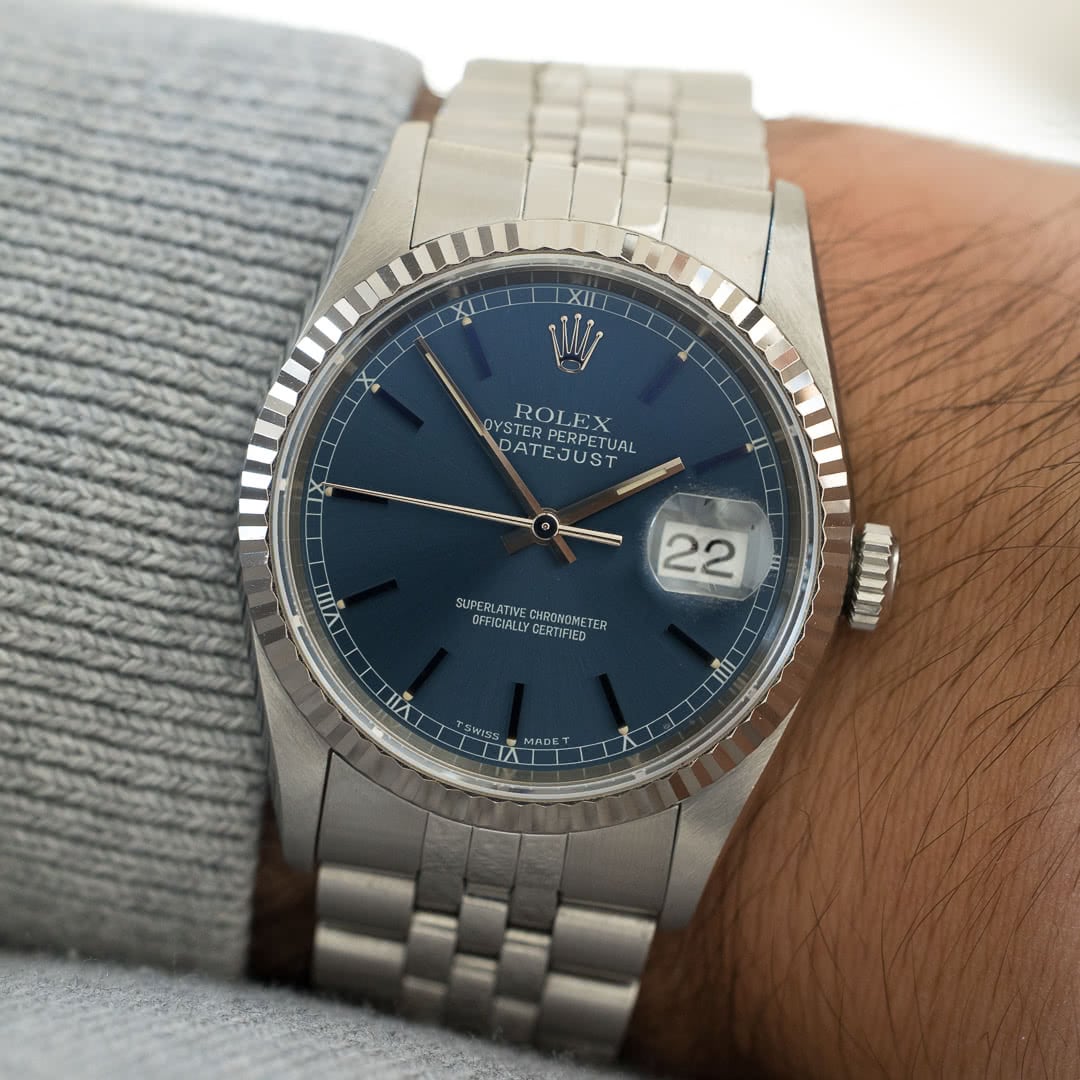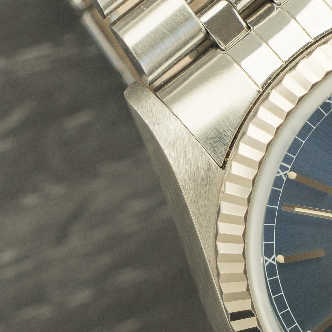 This specific piece, the blue dial, white gold fluted bezel and jubilee bracelet, probably remains one of the most sought-after and versatile timepieces of all time. The mesmerizing glossy blue dial varies from ocean blue to a poping royal blue depending on the light, giving it a lively and dynamic appearance on the wrist. The tritium of the hands and indexes sport a relatively light but charming patina, adding some vintage feel to the watch. These beautiful features are visible through the resistant sapphire glass. As we like to say, neo-vintage Rolex watches are often the perfect combination of the durability of modern watches and the charm and aesthetics of vintage watches.