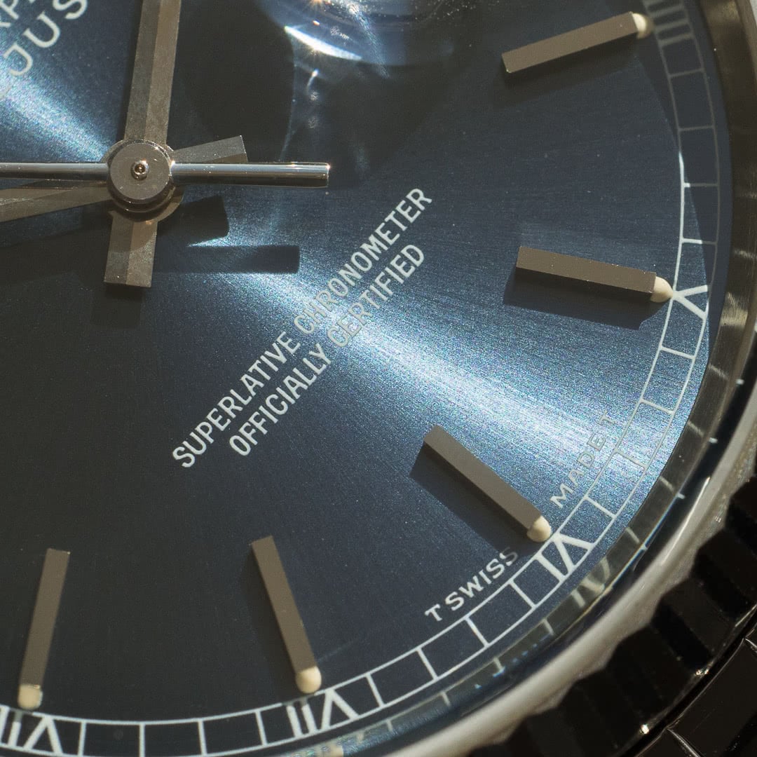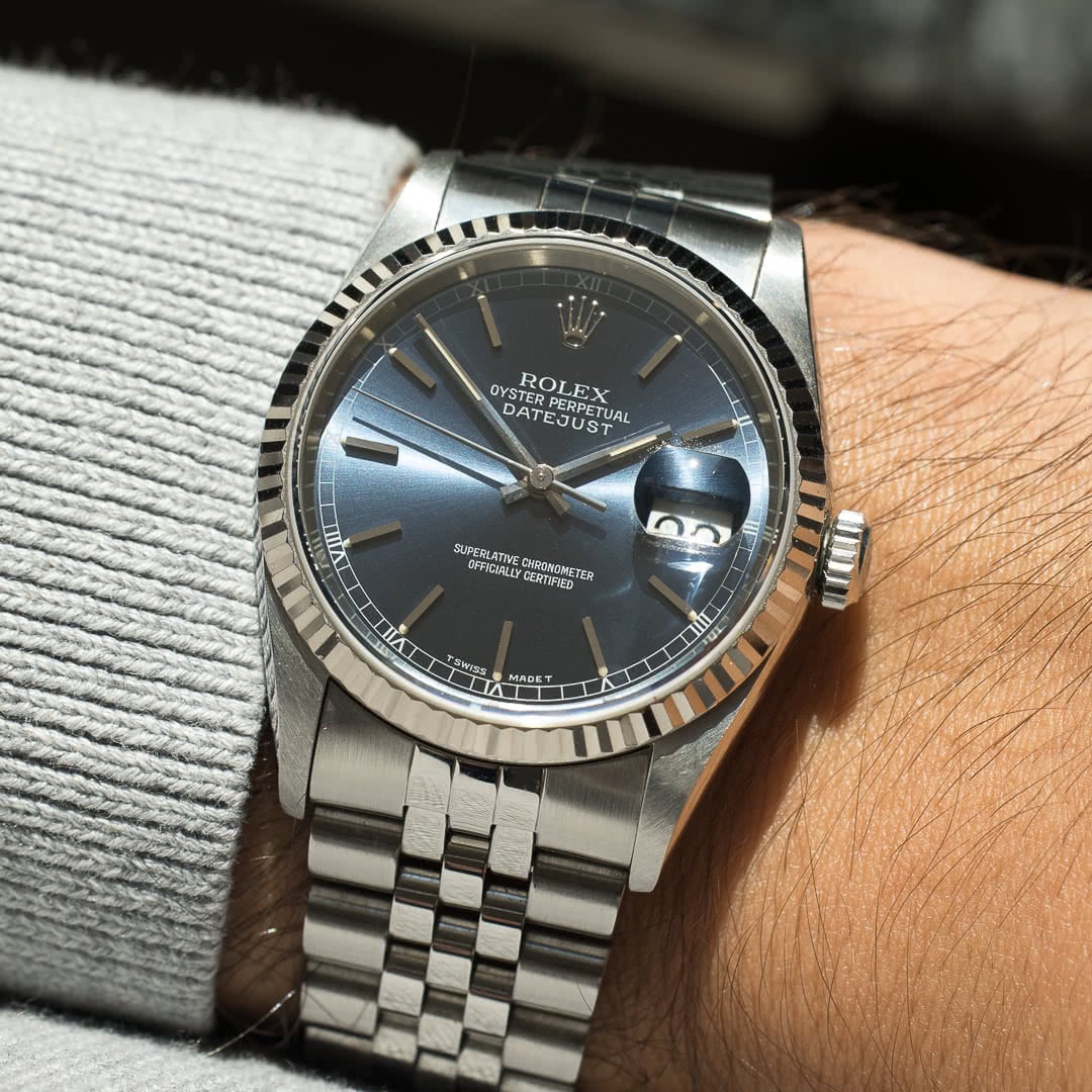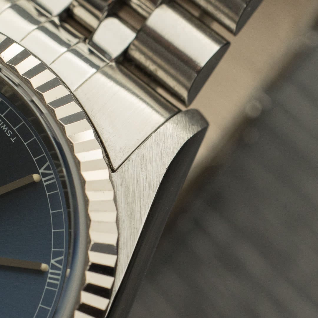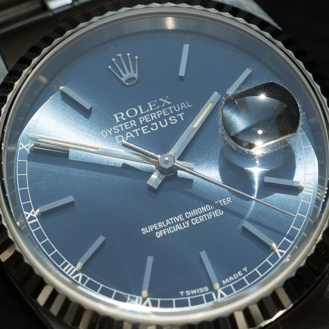 This specific piece, the blue dial, white gold fluted bezel and jubilee bracelet, probably remains one of the most sought-after and versatile timepieces of all time. The mesmerizing glossy blue dial varies from ocean blue to a poping royal blue depending on the light, giving it a lively and dynamic appearance on the wrist. The tritium of the hands and indexes sport a relatively light but charming patina, adding some vintage feel to the watch. These beautiful features are visible through the resistant sapphire glass. As we like to say, neo-vintage Rolex watches are often the perfect combination of the durability of modern watches and the charm and aesthetics of vintage watches.