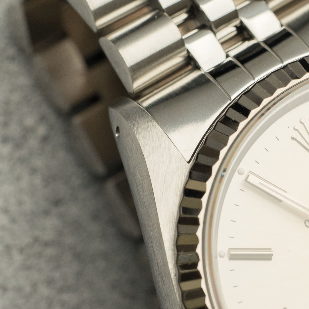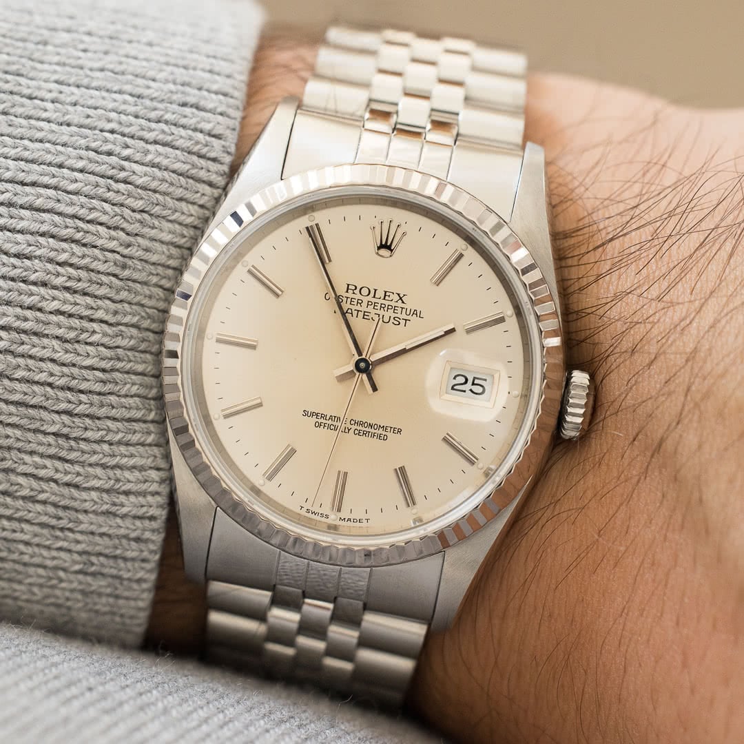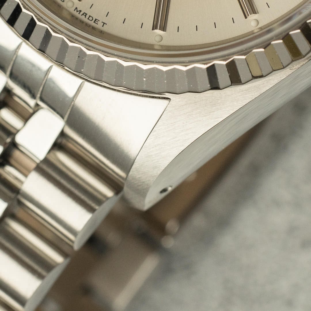 This particular piece, with its silver dial, fluted white gold bezel and jubilee bracelet, remains probably the best-known and most sought-after version, thanks in no small part to its versatility. The fascinating dial has gained an attractive patina, which makes it vary from metallic silver to a stunning sand beige colour depending on the light, giving it a lively, dynamic appearance on the wrist. The indexes and hands are in tritium, which have also gained a charming patina over time.