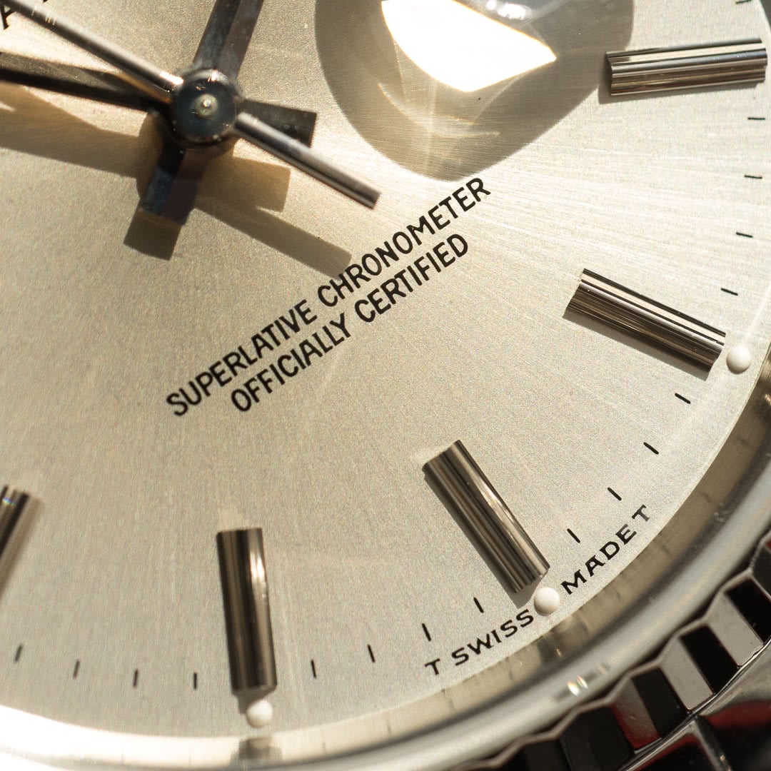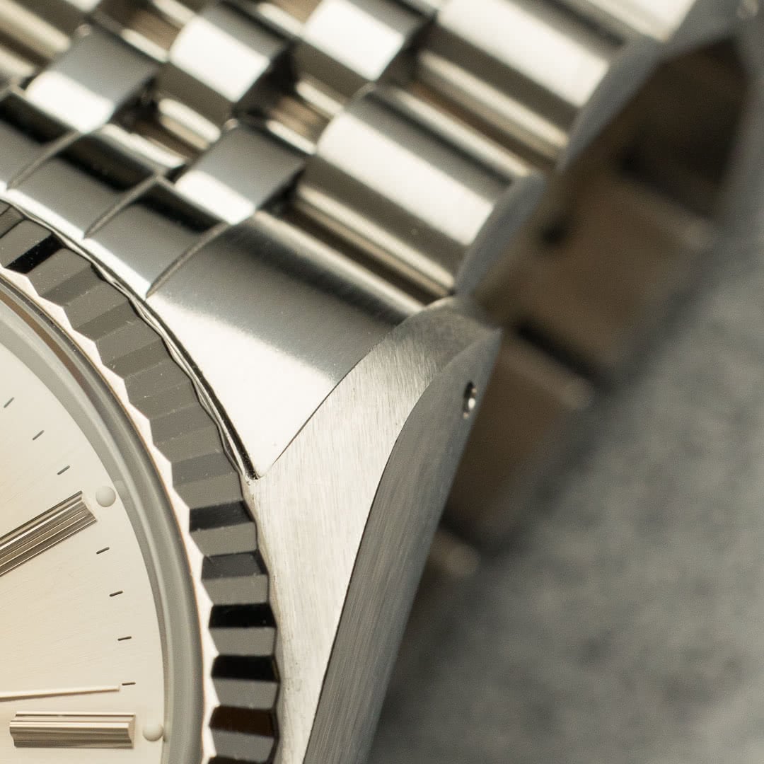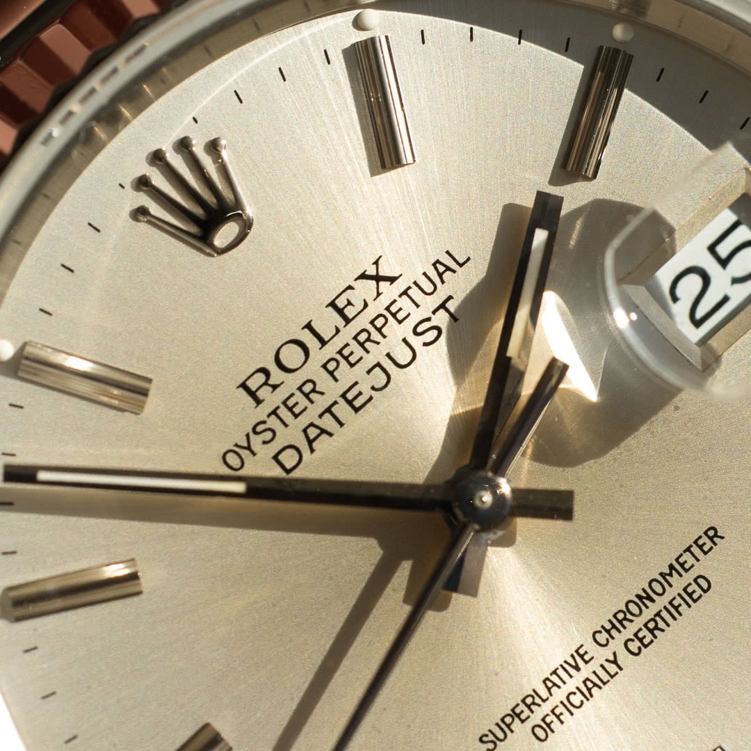This particular piece, with its silver dial, fluted white gold bezel and jubilee bracelet, remains probably the best-known and most sought-after version, thanks in no small part to its versatility. The fascinating dial has gained an attractive patina, which makes it vary from metallic silver to a stunning sand beige colour depending on the light, giving it a lively, dynamic appearance on the wrist. The indexes and hands are in tritium, which have also gained a charming patina over time.