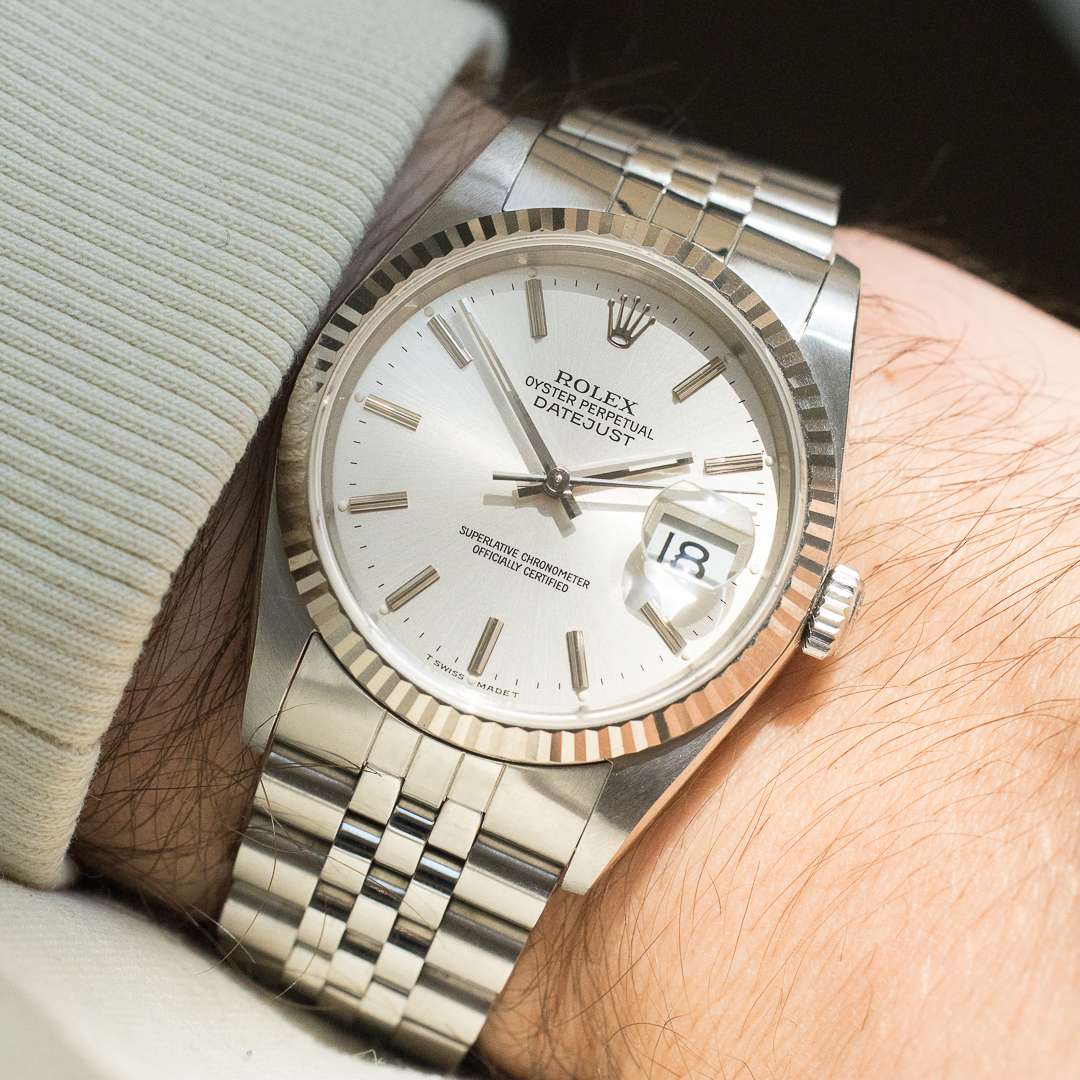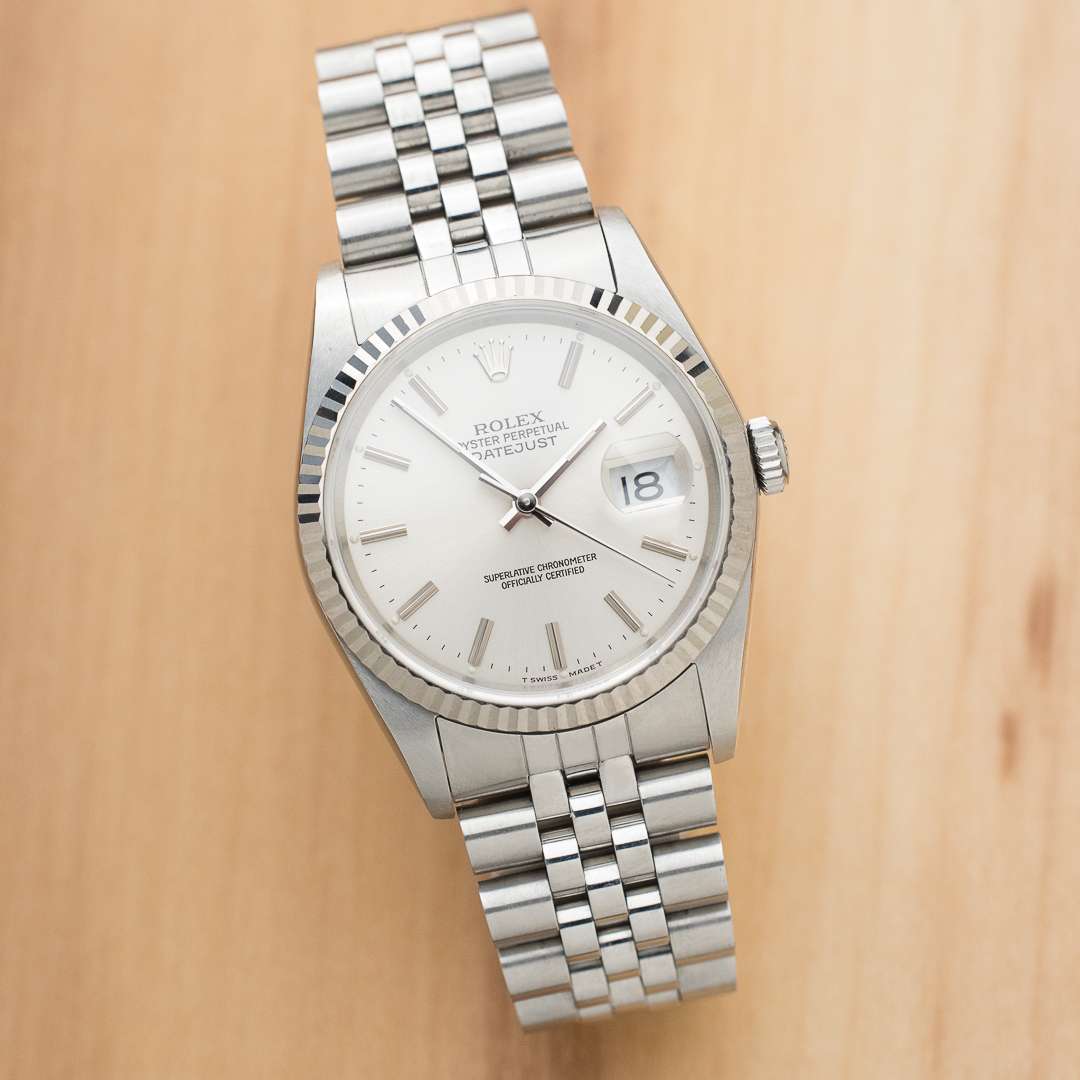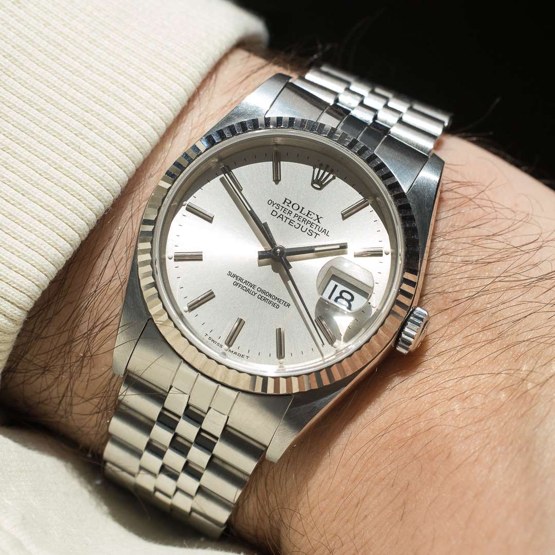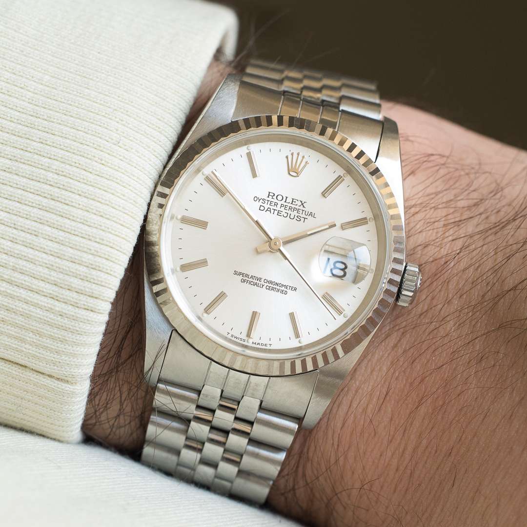 Reference 16234 is the first Datejust to have had sapphire instead of plexiglass, offering a little more resistance and a slightly more modern look than previous references. As is often the case with these neo-vintage Rolexes, the watch is a good mix, offering the strength and precision of a modern watch while retaining the aesthetics and wearability of the vintages.