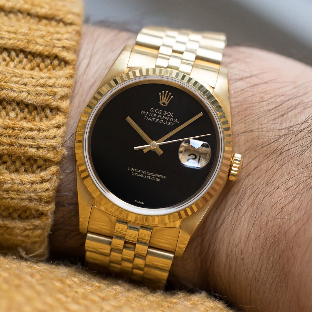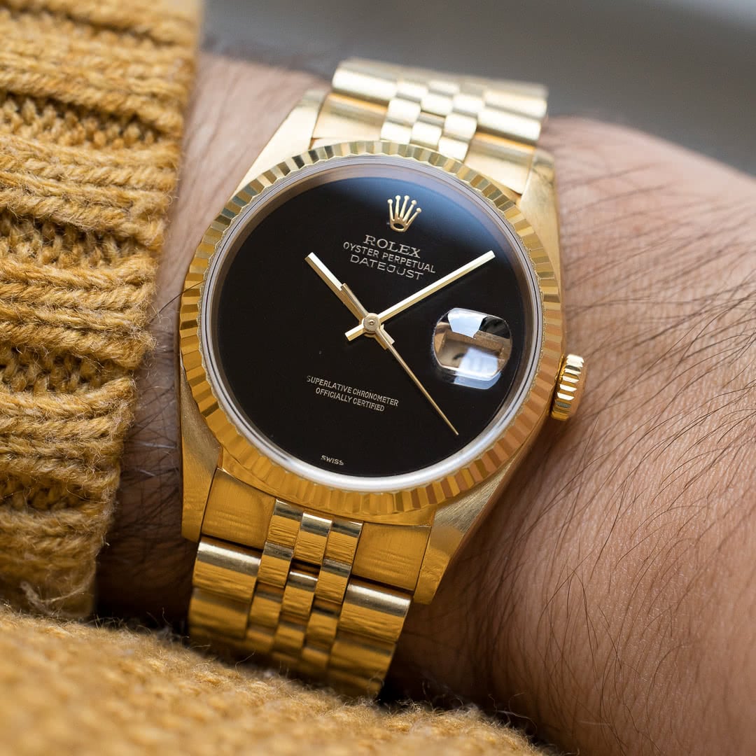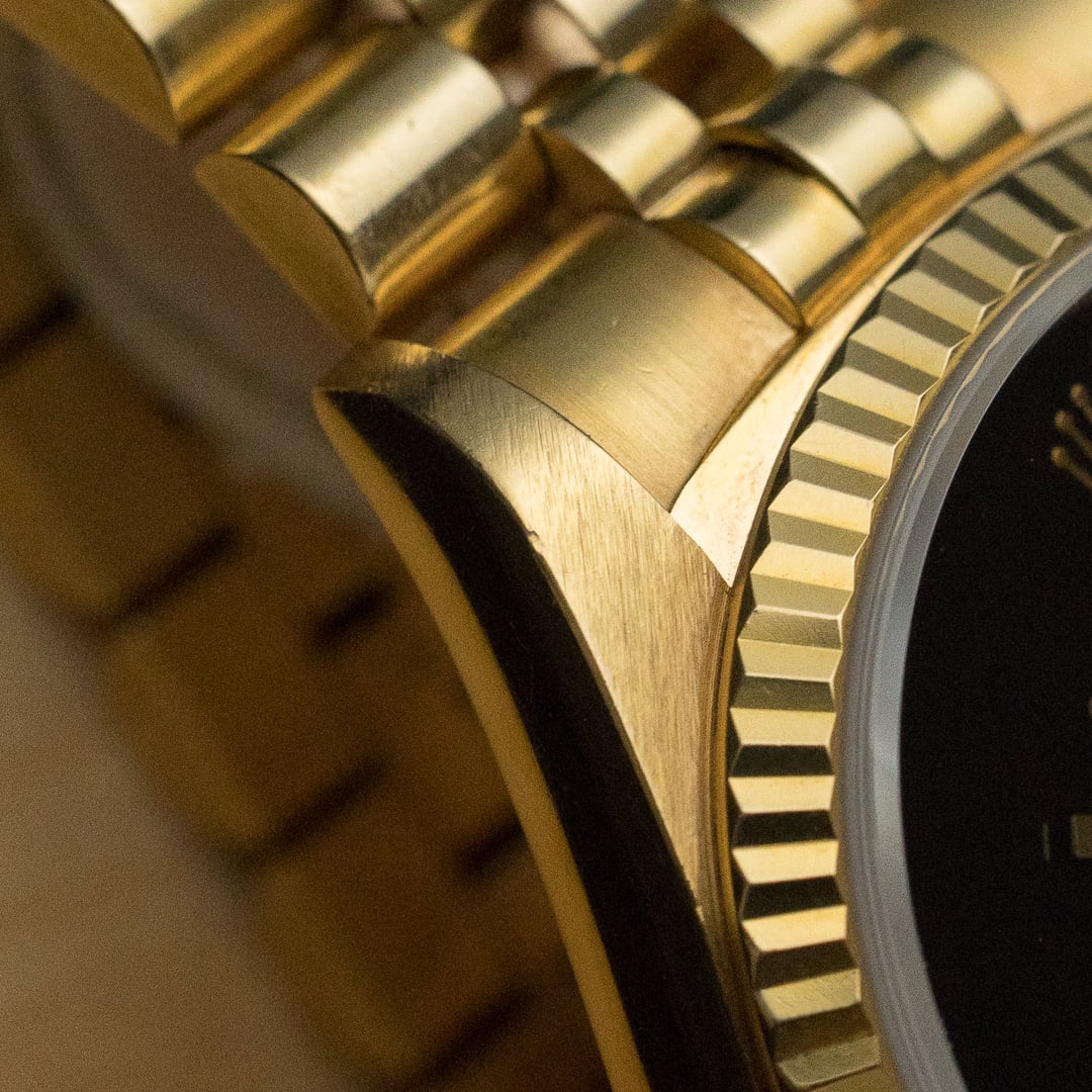 Cette pièce spécifique, avec son cadran en pierre d'onyx, sa lunette cannelée et son bracelet jubilé, reste probablement l'une des configurations les plus recherchées et les plus rares de Datejust. Ce cadran amène une profondeur et un charme inégalable. En plus d'avoir une grande valeur de collection, cette pièce est d'une esthétique sans égal, grâce au contraste entre l'or jaune et le cadran en onyx ainsi que l'état cosmétique dans lequel elle a été conservée. En effet, le boîtier et le bracelet sont en excellent état, surtout pour une montre en or jaune 18 carats vieille de 35 ans. Le plus important dans ces pièces, c'est le cadran. Il est impeccable, à l'exception d'une ébréchure à peine perceptible vers 7 heures, visible uniquement sous un certains éclairages, mais presque pas à l'œil nu. Et surtout, il est d'origine, avec sa mention « Swiss » qui correspond à cette période. Les aiguilles et le bracelet sont également d'origine. Cette pièce fait partie de ces montres exceptionnelles qui ne nécessitent aucune explication ; les photos parlent d'elles-mêmes.