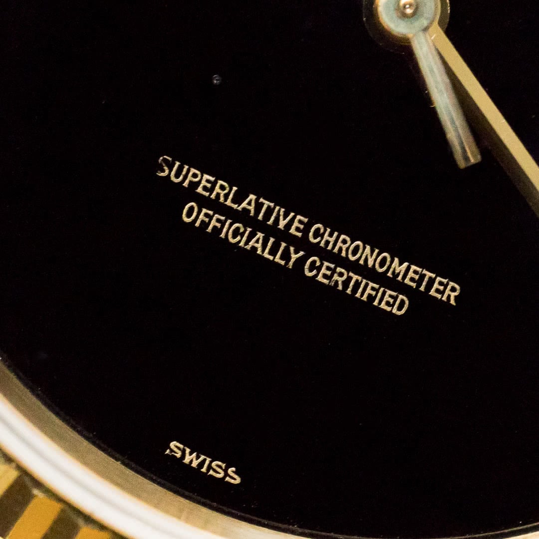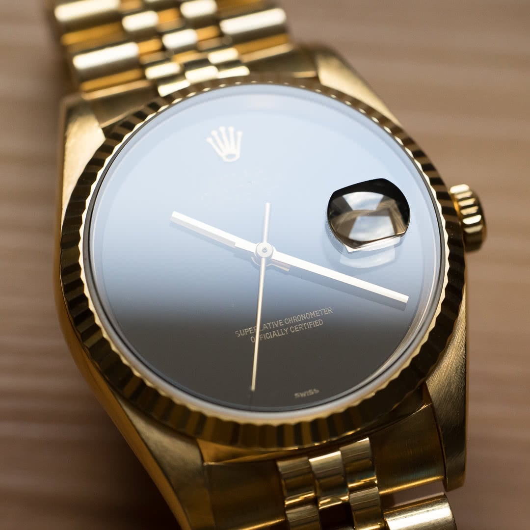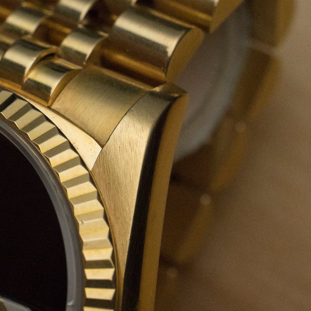 Cette pièce spécifique, avec son cadran en pierre d'onyx, sa lunette cannelée et son bracelet jubilé, reste probablement l'une des configurations les plus recherchées et les plus rares de Datejust. Ce cadran amène une profondeur et un charme inégalable. En plus d'avoir une grande valeur de collection, cette pièce est d'une esthétique sans égal, grâce au contraste entre l'or jaune et le cadran en onyx ainsi que l'état cosmétique dans lequel elle a été conservée. En effet, le boîtier et le bracelet sont en excellent état, surtout pour une montre en or jaune 18 carats vieille de 35 ans. Le plus important dans ces pièces, c'est le cadran. Il est impeccable, à l'exception d'une ébréchure à peine perceptible vers 7 heures, visible uniquement sous un certains éclairages, mais presque pas à l'œil nu. Et surtout, il est d'origine, avec sa mention « Swiss » qui correspond à cette période. Les aiguilles et le bracelet sont également d'origine. Cette pièce fait partie de ces montres exceptionnelles qui ne nécessitent aucune explication ; les photos parlent d'elles-mêmes.