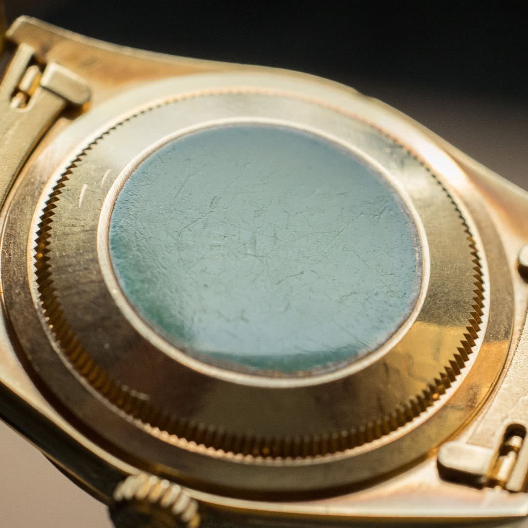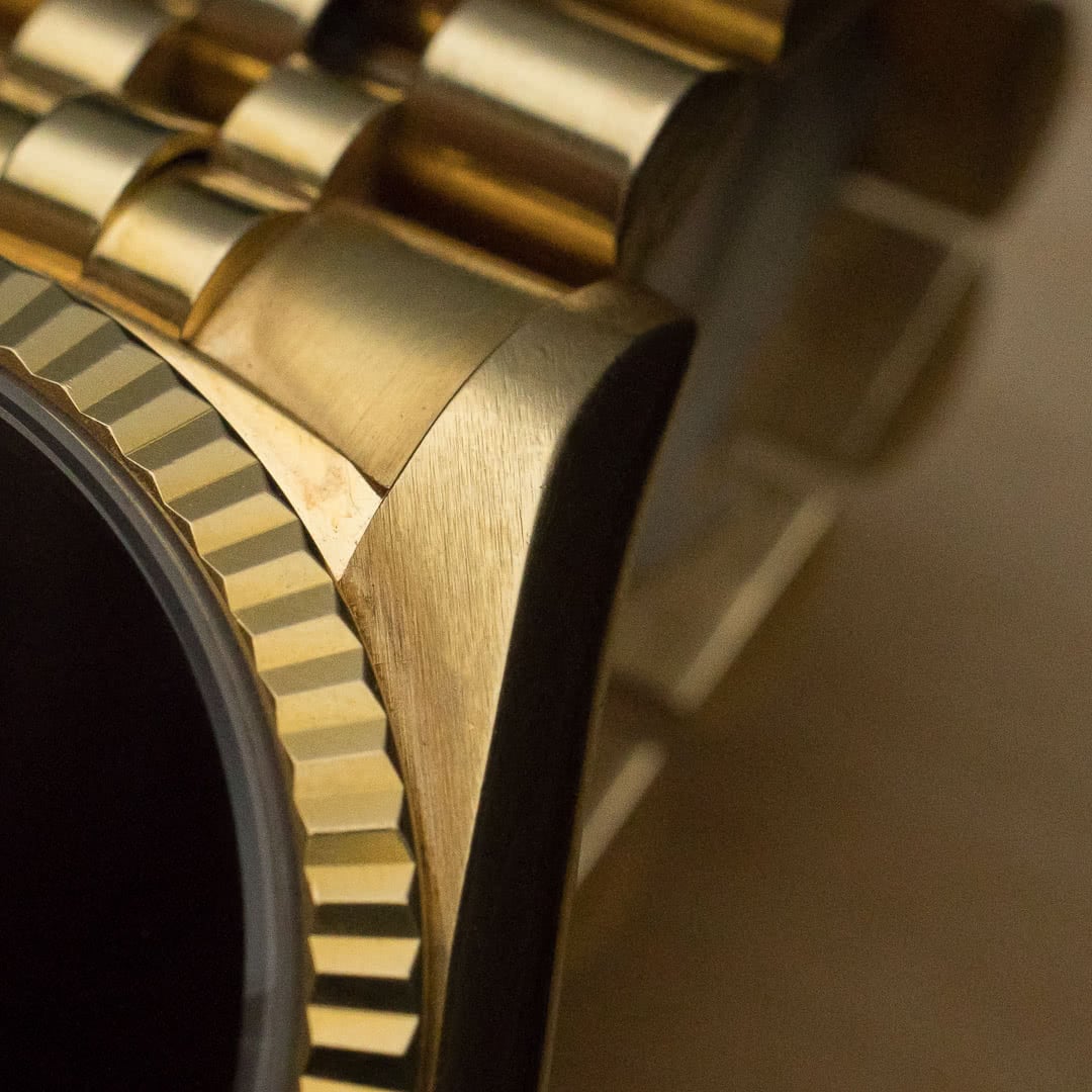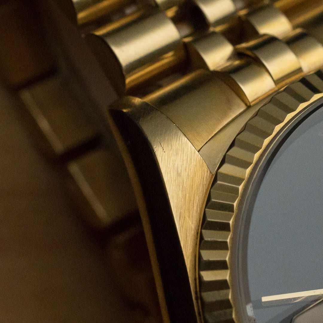 Le boîtier a beaucoup de matière et des arêtes vives. La montre a certainement été repolie, mais ceci a bien été fait et a permis de conserver une grande partie de la matière du boîtier. C'est d'autant plus spectaculaire que la montre a bientôt 50 ans et est en or jaune 18k.