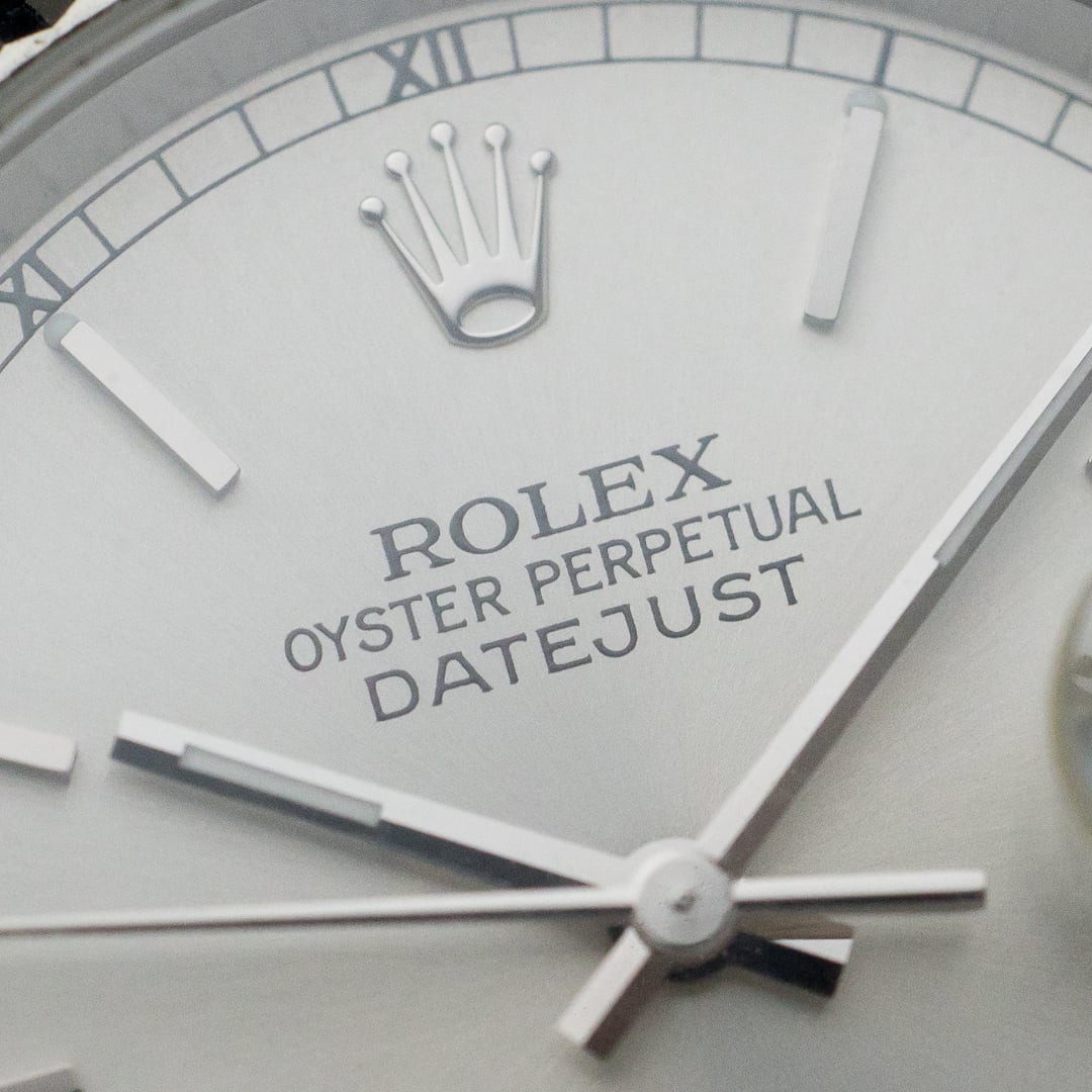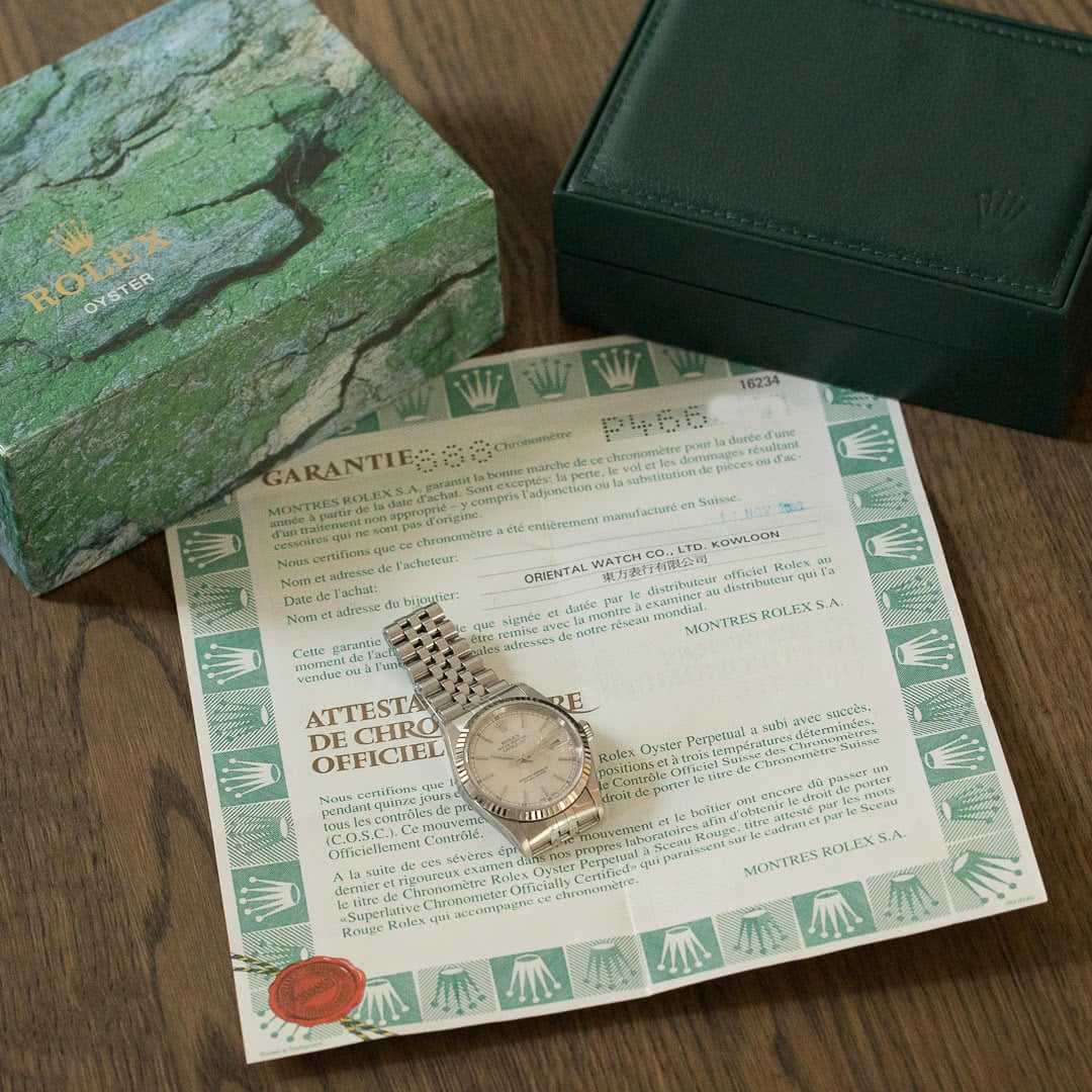 The timeless, classic and elegant Rolex Datejust in 36mm is a must-have in any collection and one of the best starting pieces. This specific piece was sold in 2000 in Kowloon and has never been polished. With its stunning silver sunburst dial, it is the original classic and elegant Datejust. The case and bracelet are made of stainless steel, and the bezel of white gold.
