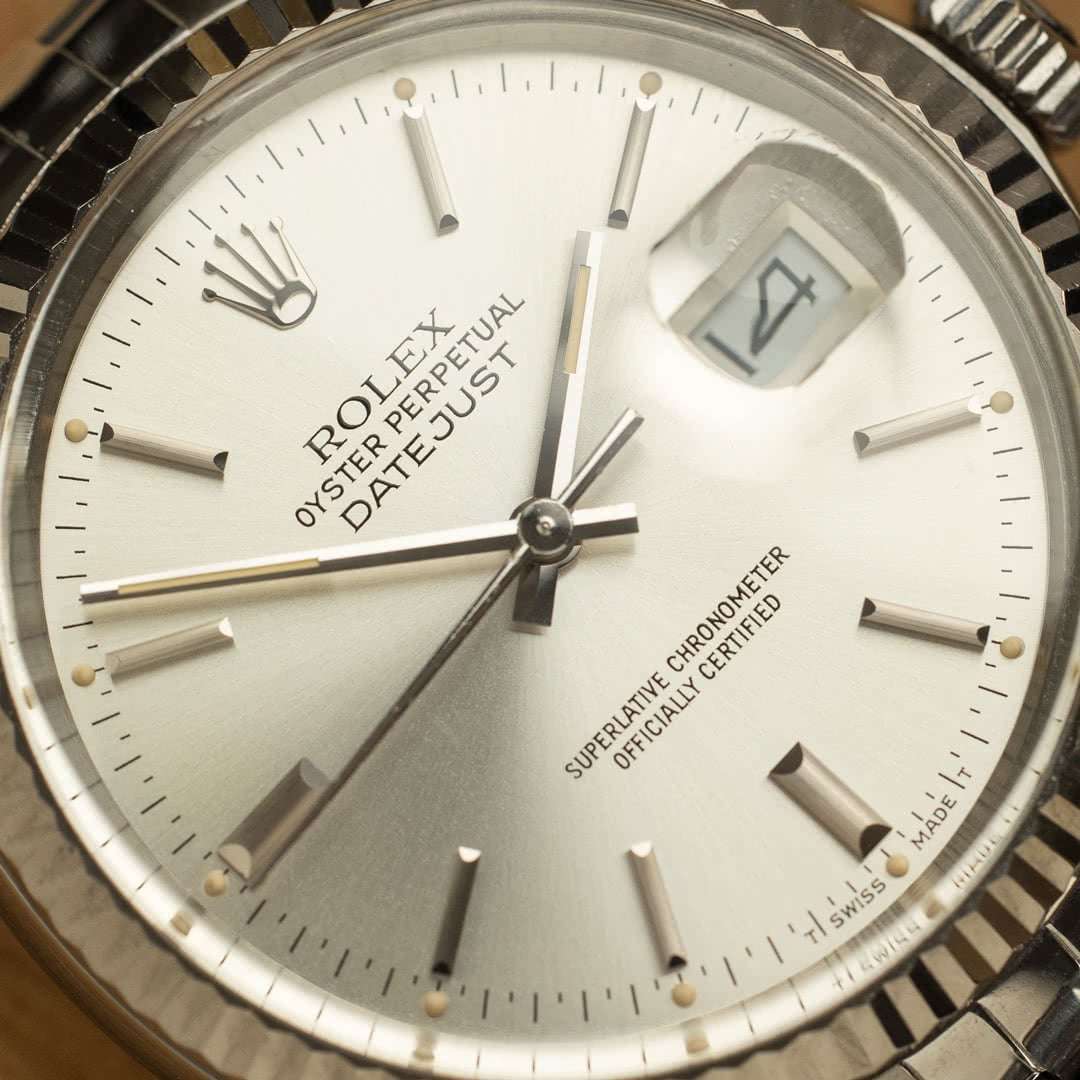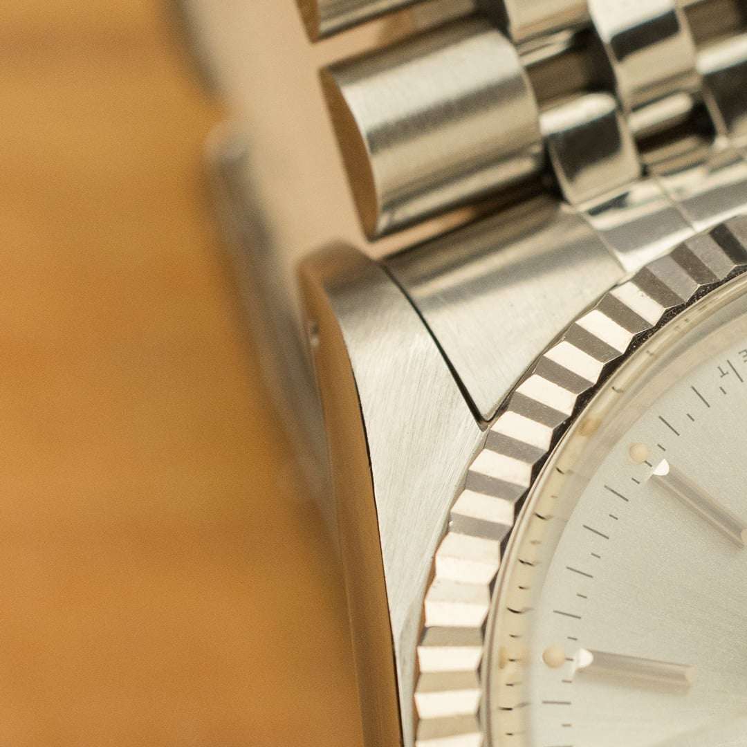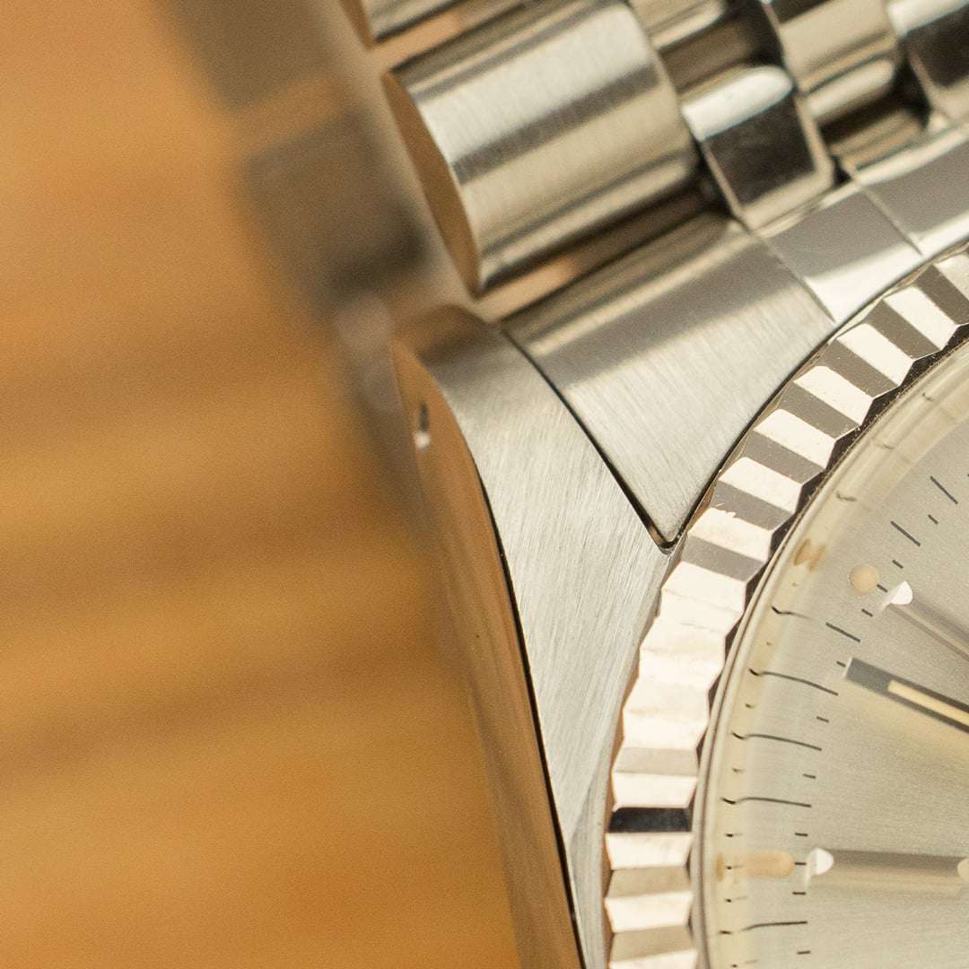 Cette pièce spécifique, avec son cadran argent, sa lunette cannelée en or blanc et son bracelet jubilé, reste probablement la version la plus connue et recherchée, grâce notamment à sa versatilité. Ce fascinant cadran varie de l’argent métallique au champagne clair en fonction de la lumière, ce qui lui confère une apparence vivante et dynamique au poignet. Les indexes et les aiguilles sont en tritium, ce dernier ayant gagné une belle patine beige, ce qui rend la pièce d’autant plus esthétique.