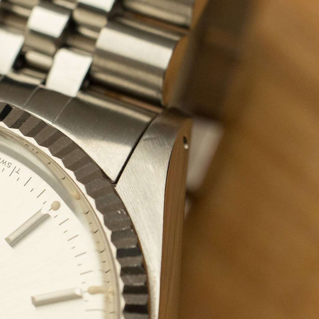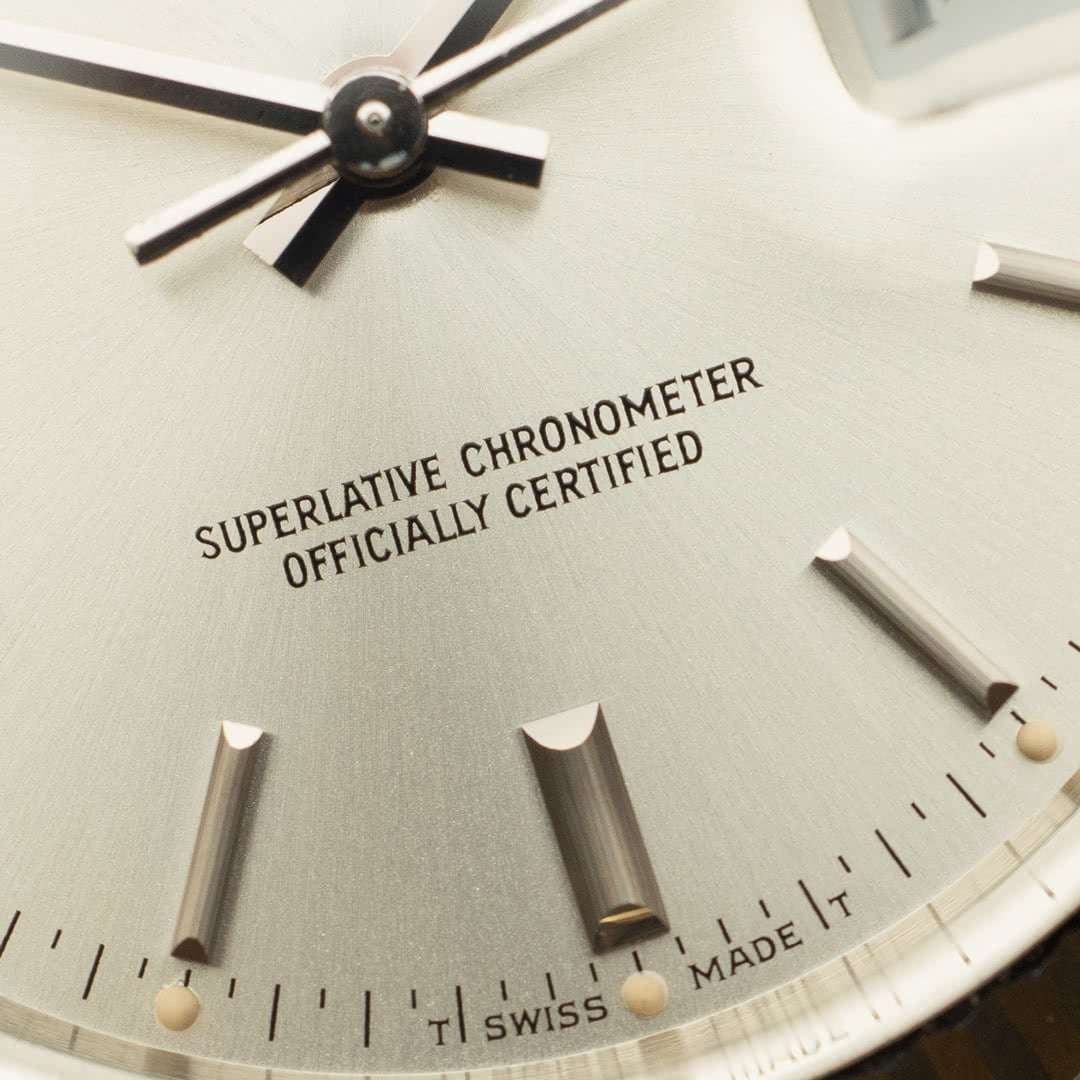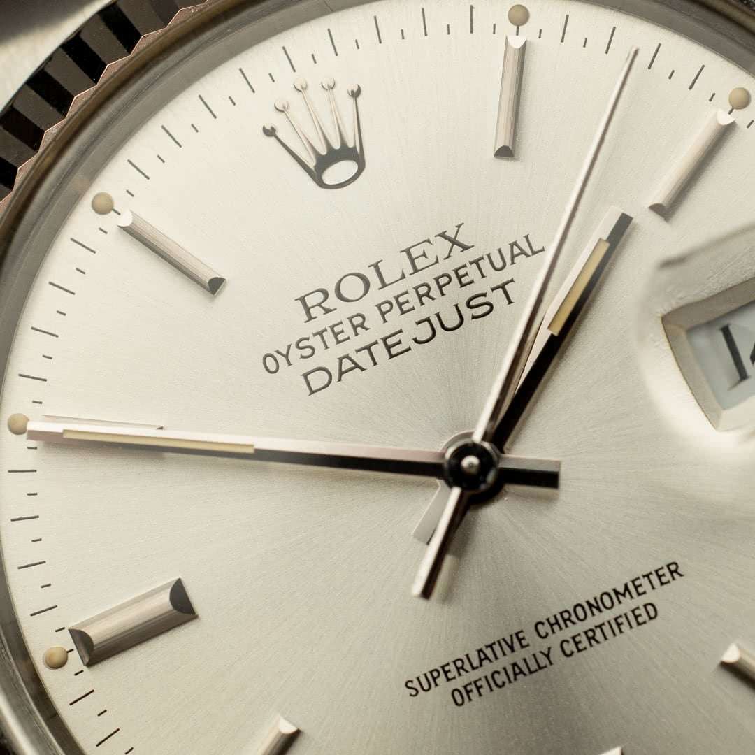 Cette pièce spécifique, avec son cadran argent, sa lunette cannelée en or blanc et son bracelet jubilé, reste probablement la version la plus connue et recherchée, grâce notamment à sa versatilité. Ce fascinant cadran varie de l’argent métallique au champagne clair en fonction de la lumière, ce qui lui confère une apparence vivante et dynamique au poignet. Les indexes et les aiguilles sont en tritium, ce dernier ayant gagné une belle patine beige, ce qui rend la pièce d’autant plus esthétique.