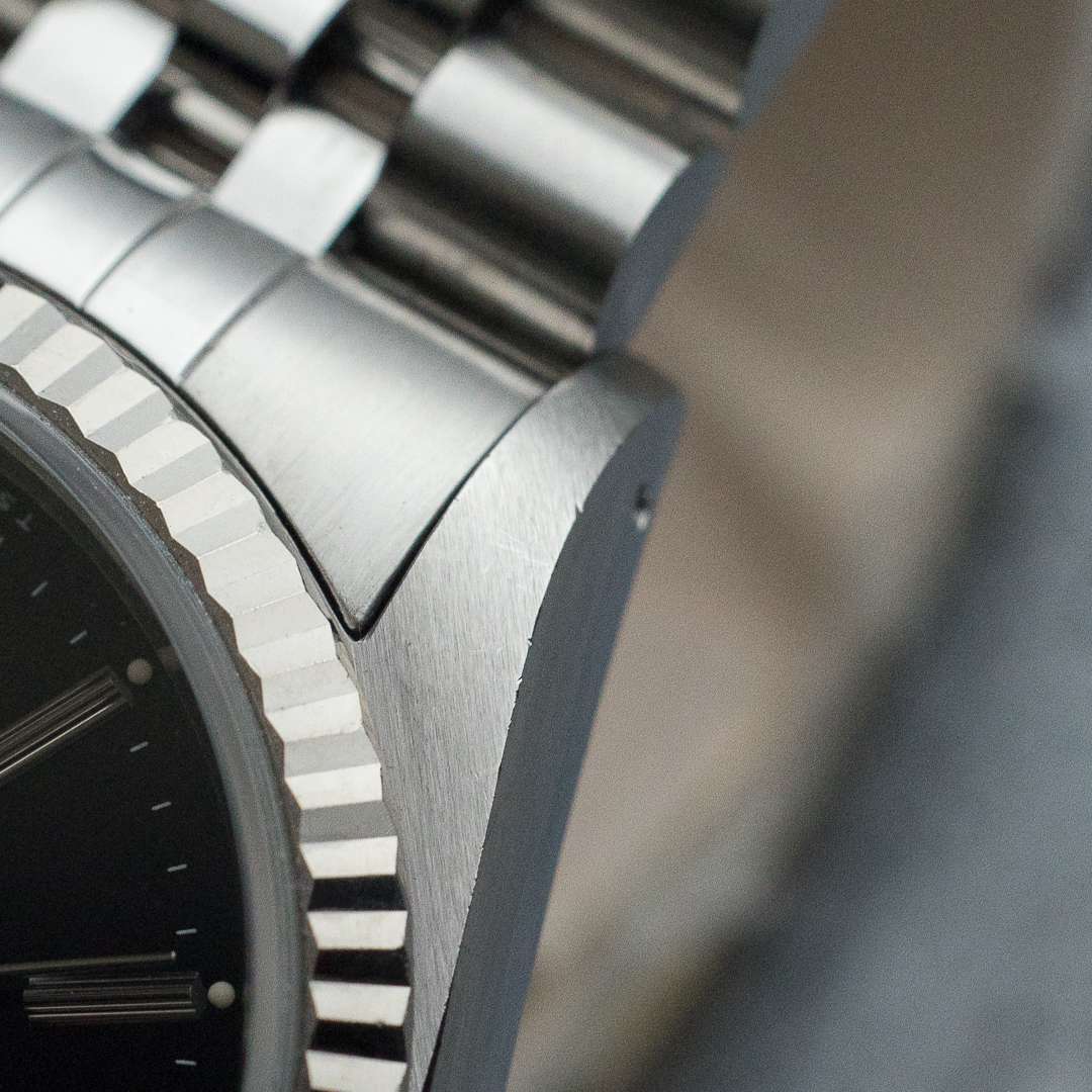 Le boîtier présente des arêtes vives et la lunette n'a jamais été polie.