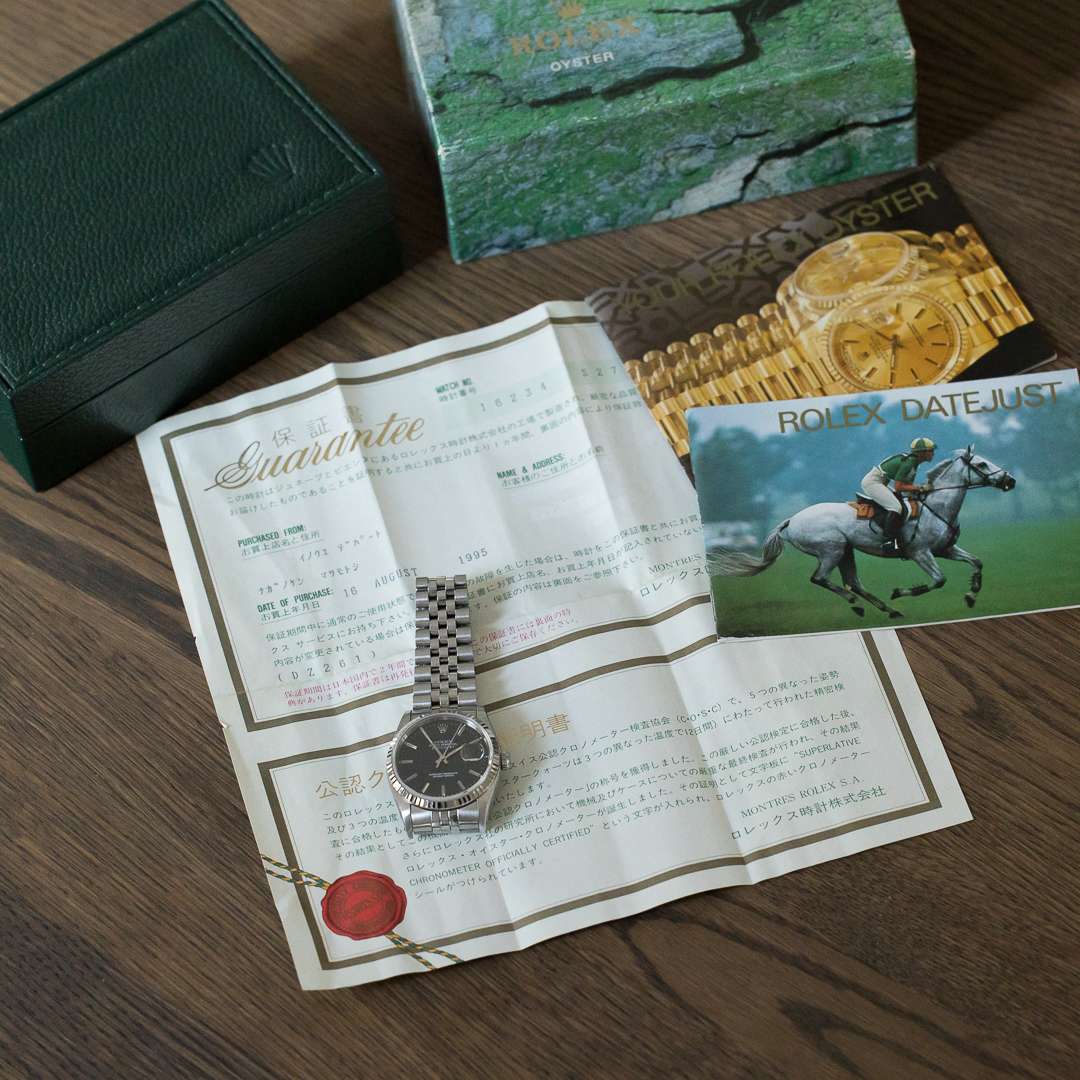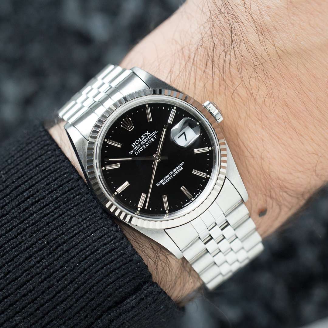 La Rolex Datejust 36 mm, intemporelle, classique et élégante, est un must dans toute collection digne de ce nom. Cette pièce en particulier da été vendue en 1995. Son superbe cadran noir complémente parfaitement le boitier et le bracelet en acier ainsi que la fameuse lunette cannelée en or blanc.