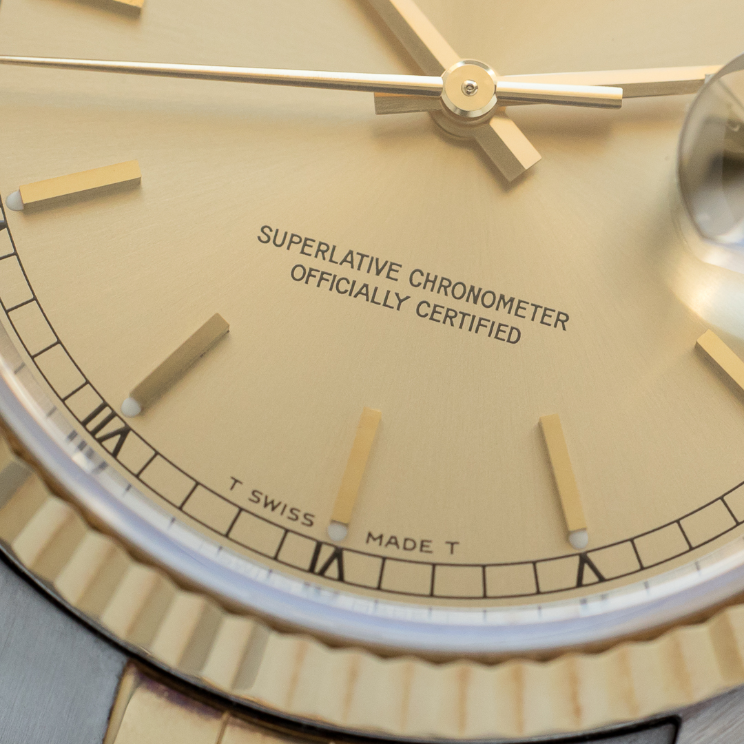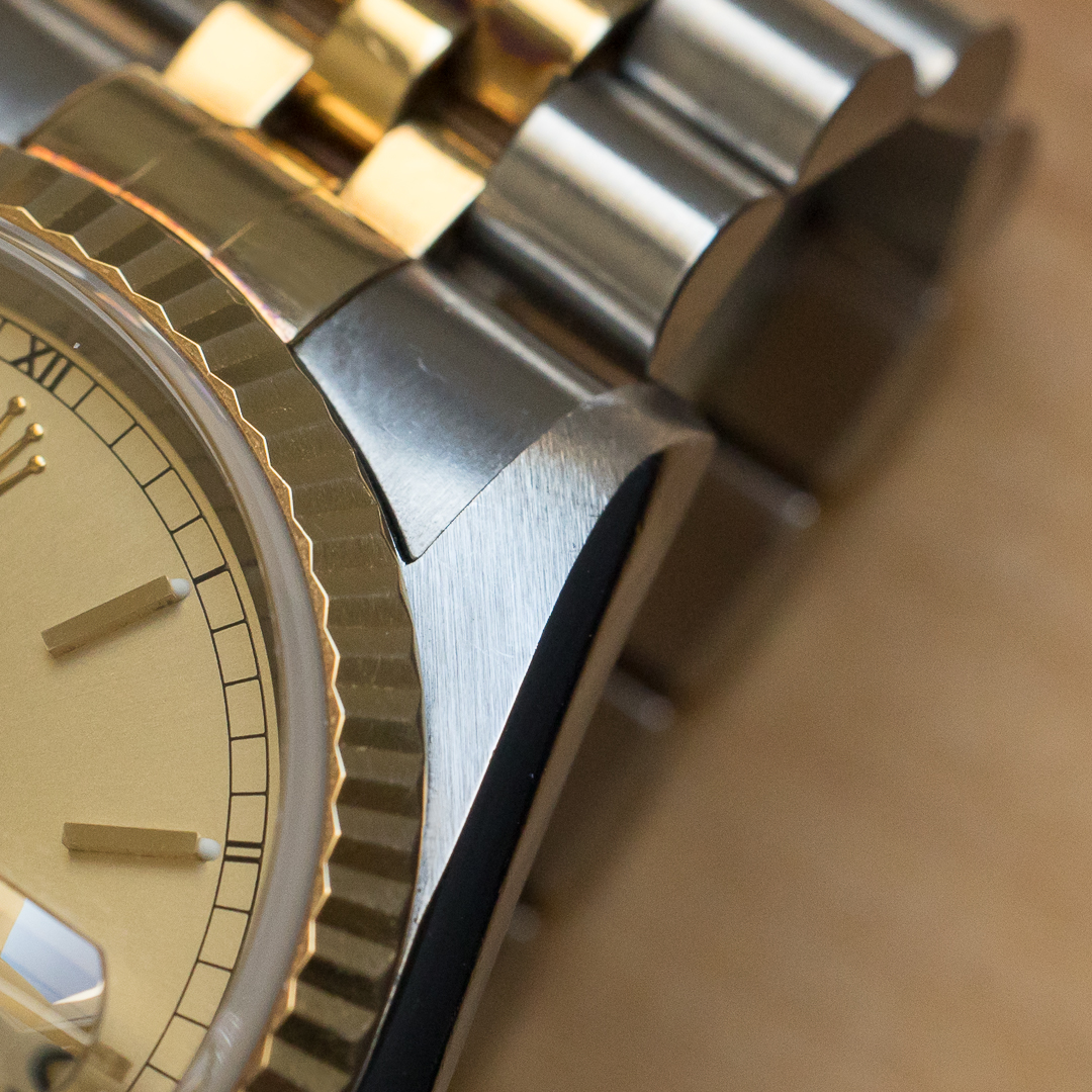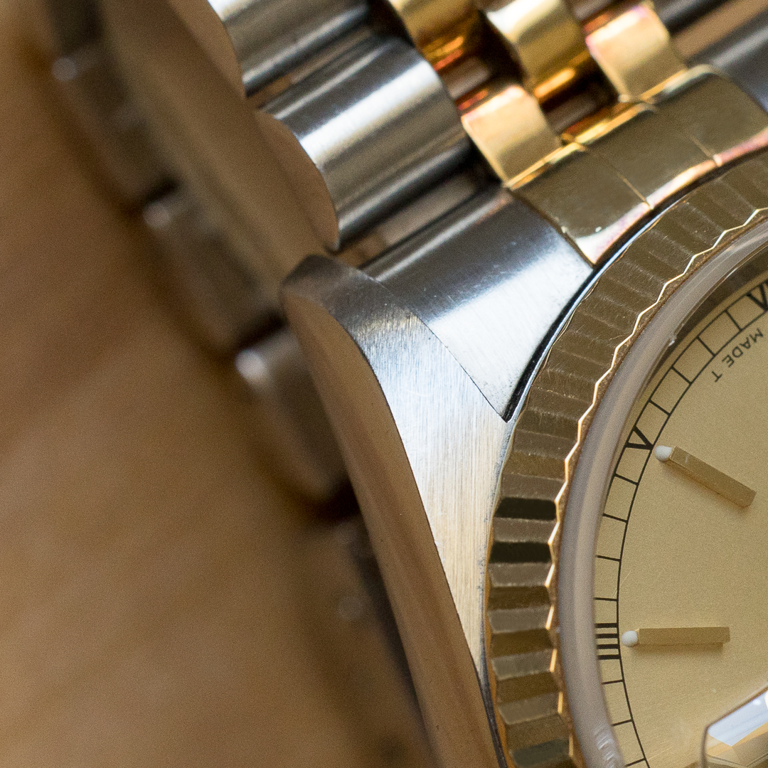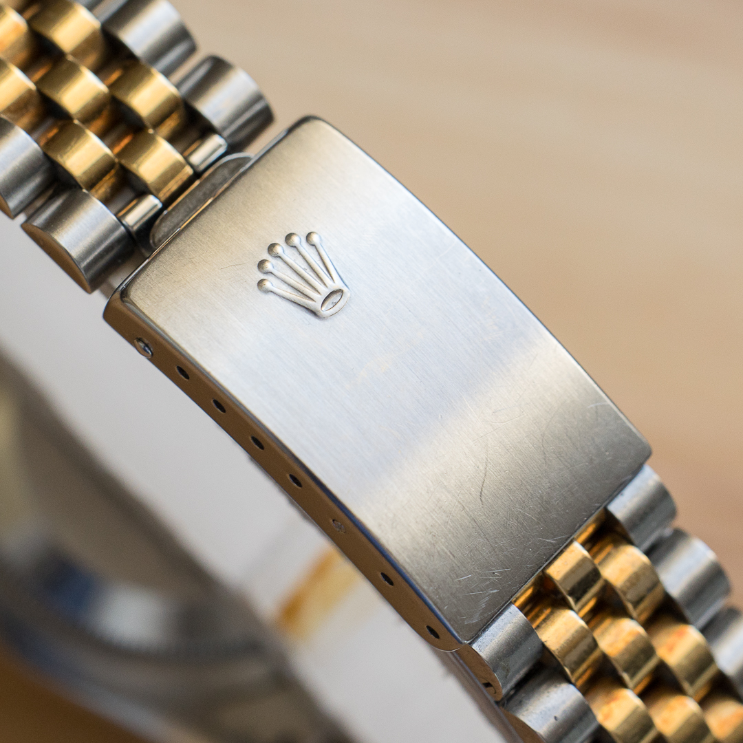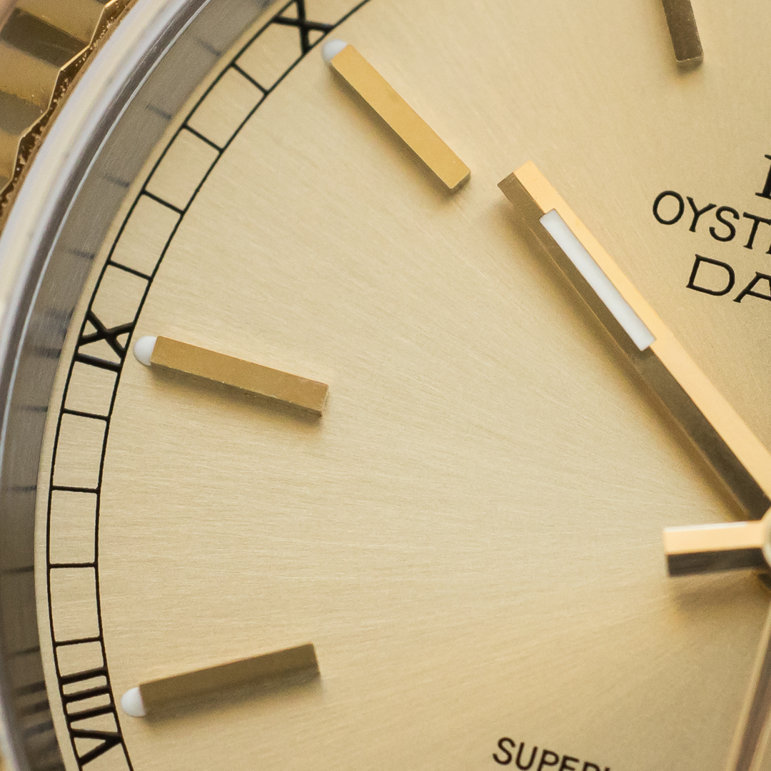 The reference 16233 saw the introduction of sapphire crystal, improving robustness compared to older references. The watch also features a quickset date setting. It has been very well preserved over the years, the case and bracelet appaears to be unpolished and show a lovely gold oxidation. The champagne dial, which blends perfectly into the continuity of the bracelet and case, is impeccable. The tritium of the hands and indexes has remained relatively clear but tending to a beige tint, contrasting nicely with the dial. Although classic, the dial varies in colour according to the light, lending it a great deal of charm.