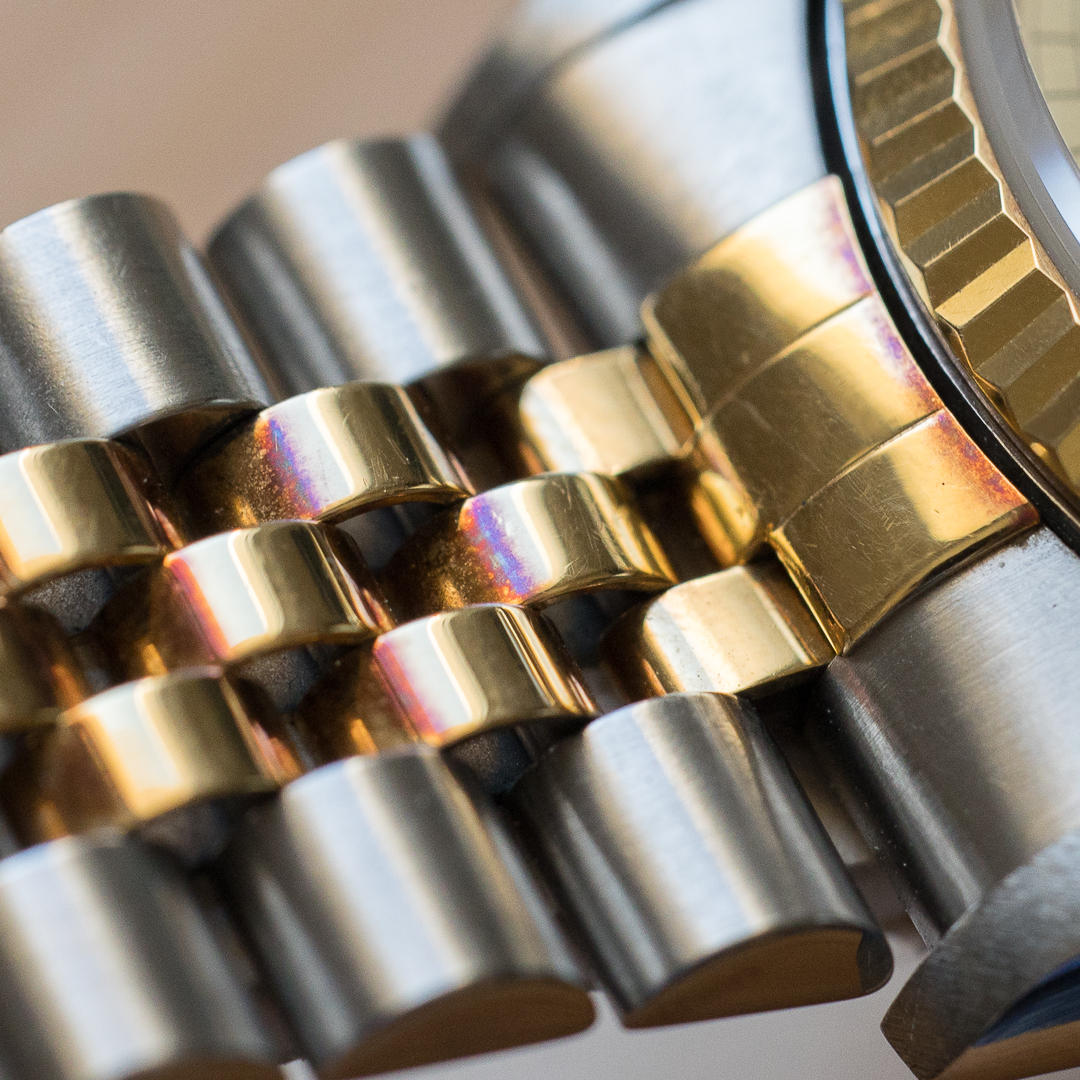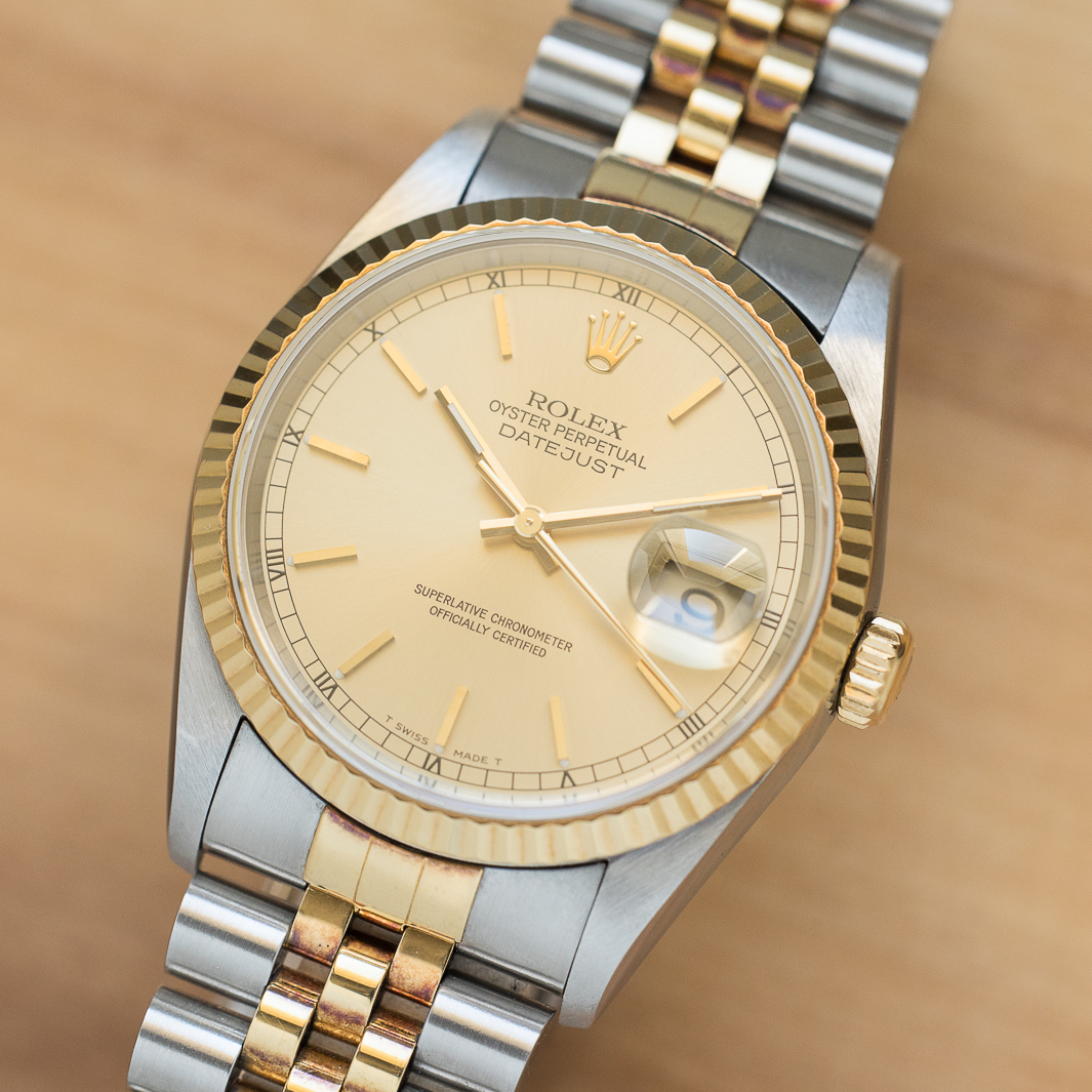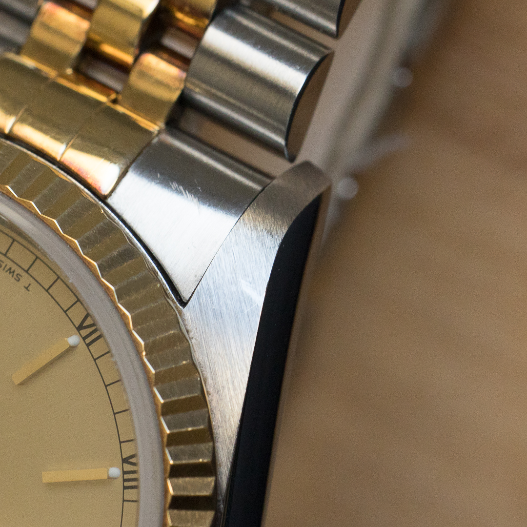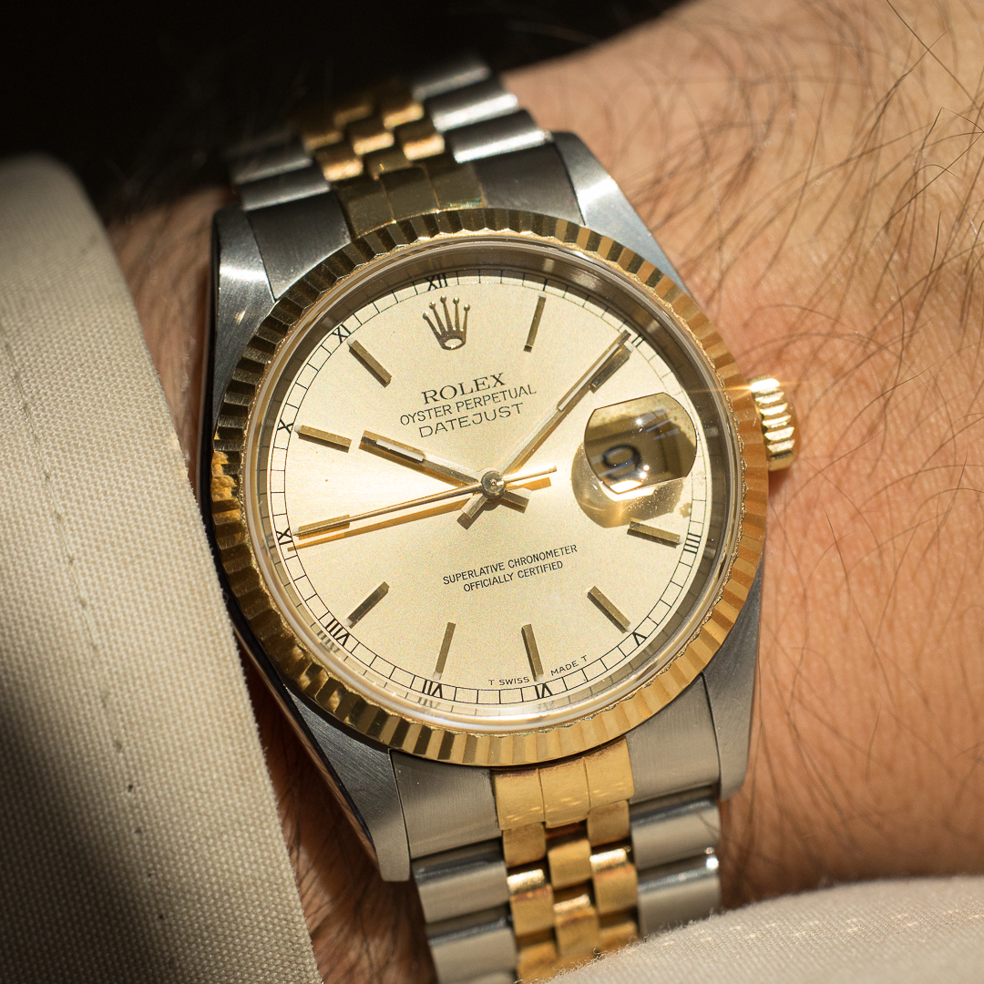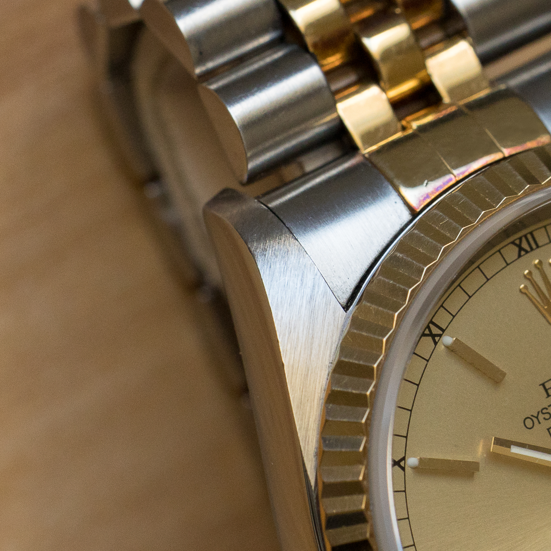 The reference 16233 saw the introduction of sapphire crystal, improving robustness compared to older references. The watch also features a quickset date setting. It has been very well preserved over the years, the case and bracelet appaears to be unpolished and show a lovely gold oxidation. The champagne dial, which blends perfectly into the continuity of the bracelet and case, is impeccable. The tritium of the hands and indexes has remained relatively clear but tending to a beige tint, contrasting nicely with the dial. Although classic, the dial varies in colour according to the light, lending it a great deal of charm.