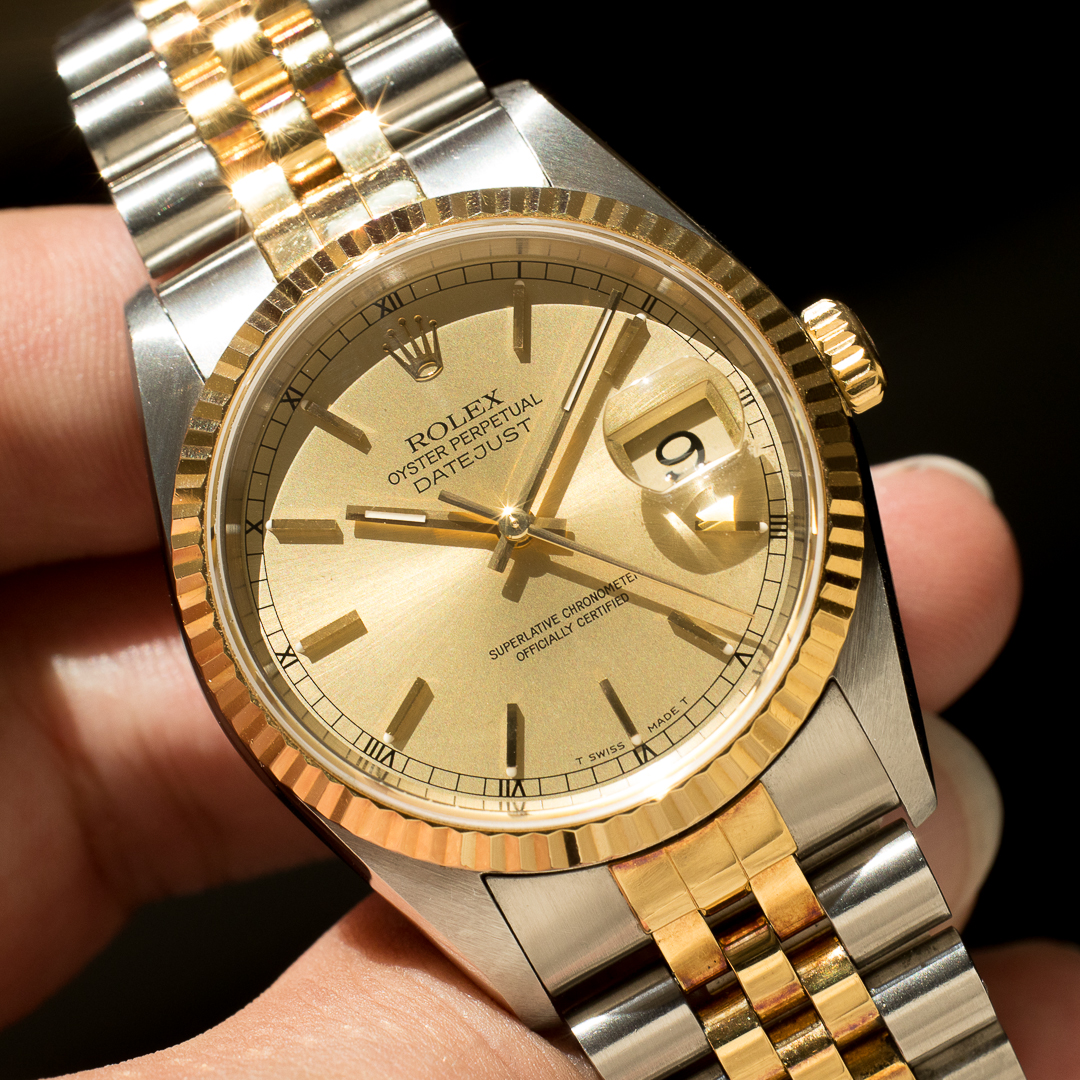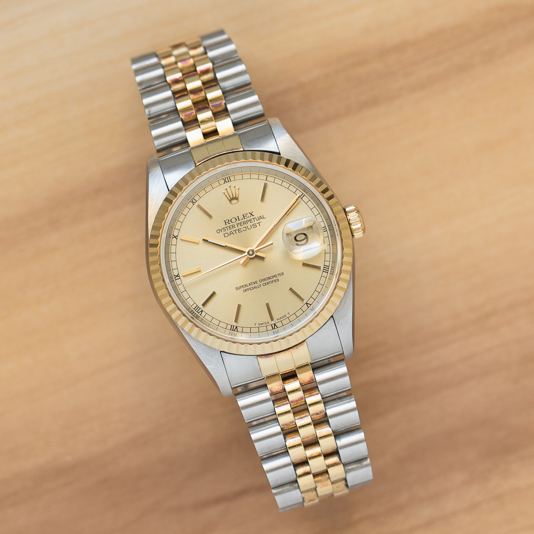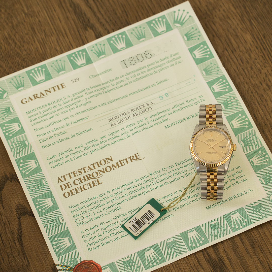 The timeless, classic and elegant Rolex Datejust 36 mm is a must-have in any collection, and one of the best pieces for getting started in luxury watchmaking. This specific timepiece, a reference 16233, has been sold at the famous Aramco dealership. Its superb champagne dial harmonizes perfectly with the steel and yellow gold case and bracelet.