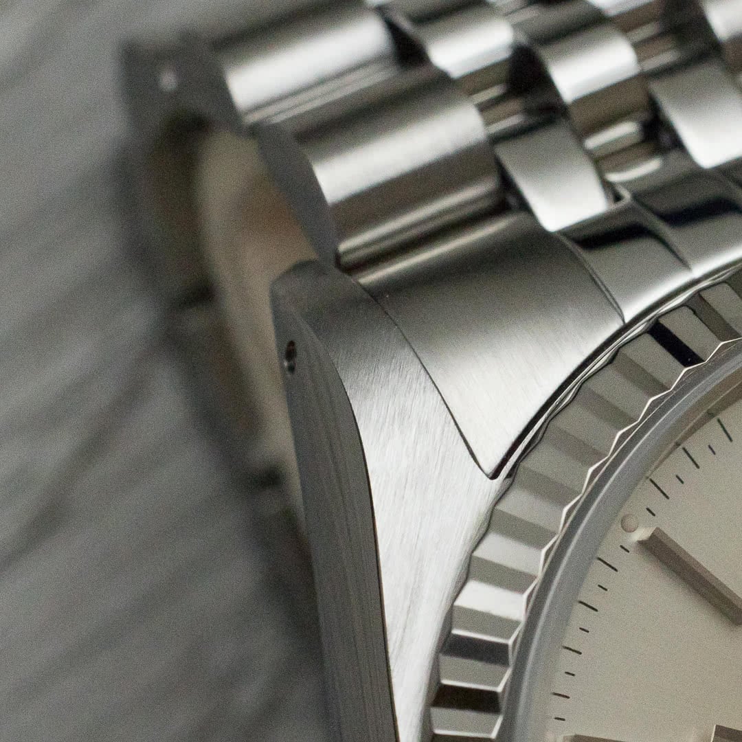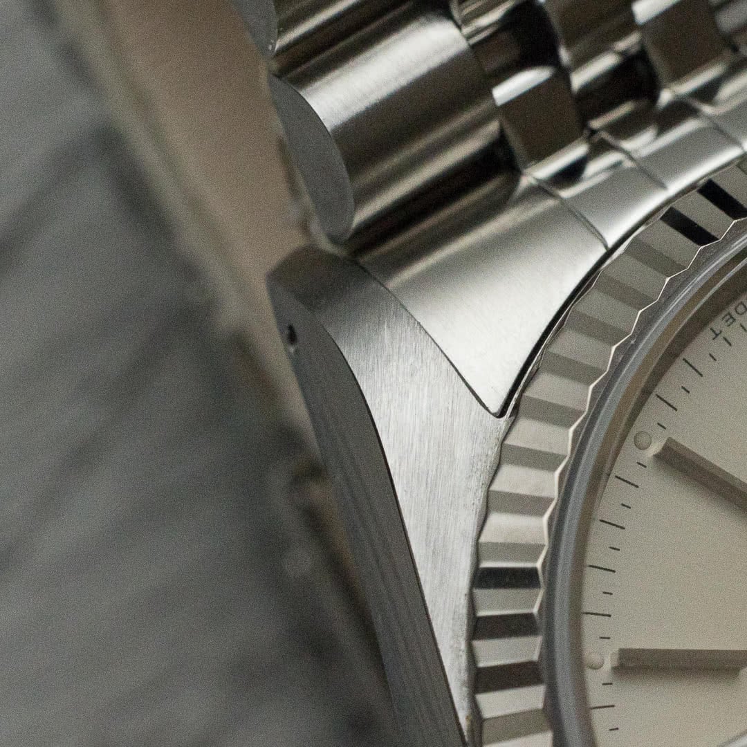 Cette pièce spécifique, avec son cadran argent, sa lunette cannelée en or blanc et son bracelet jubilé, reste probablement la version la plus connue et recherchée, grâce notamment à sa versatilité. Ce fascinant cadran varie de l’argent métallique au champagne en fonction de la lumière, ce qui lui confère une apparence vivante et dynamique au poignet. Les indexes et les aiguilles sont au tritium, ce dernier ayant gagné une charmante patine.