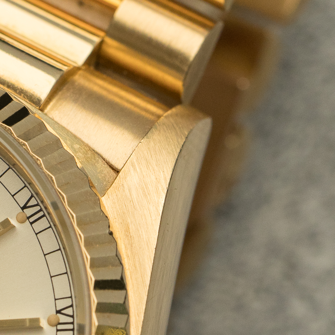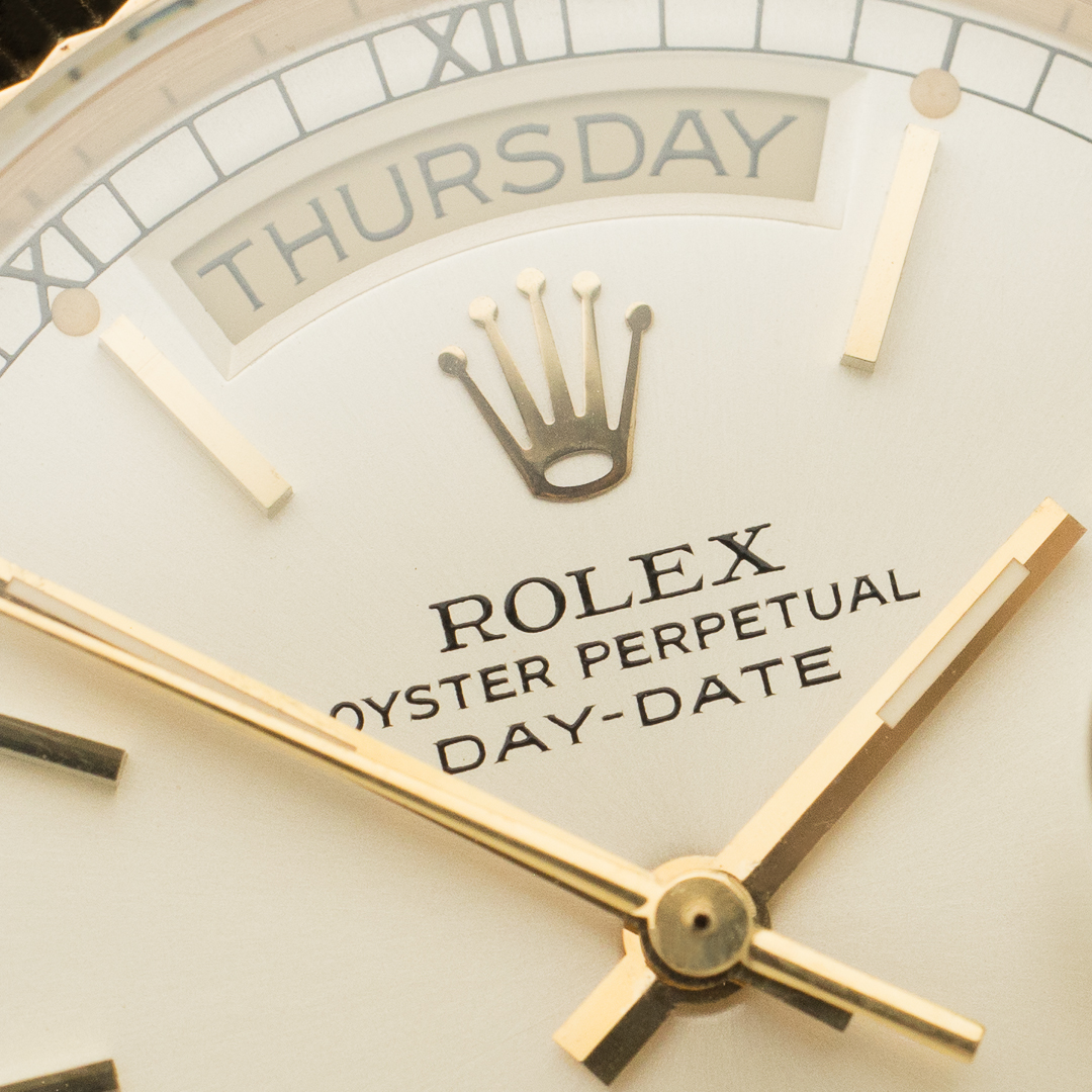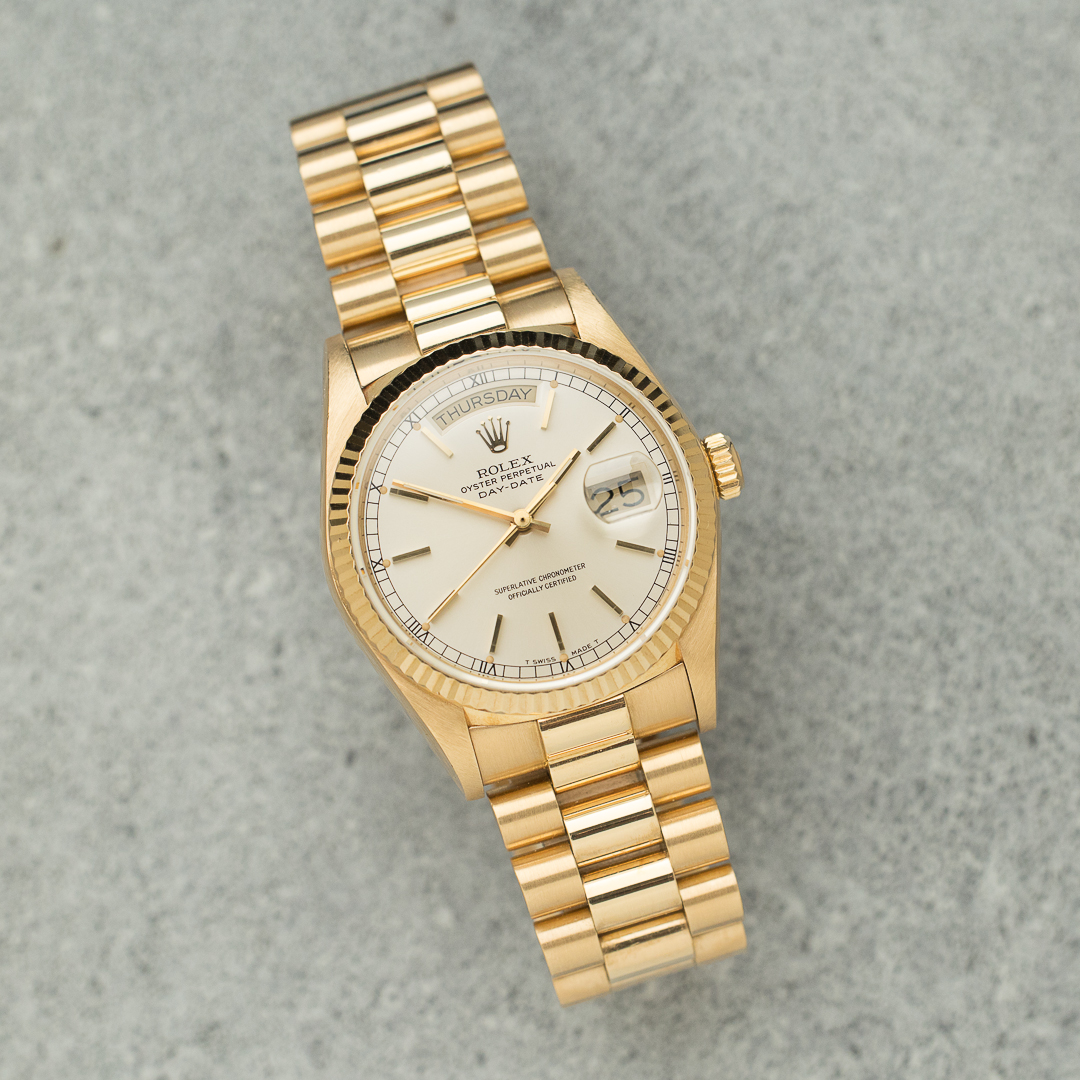 The Rolex Day Date, also known as the "Rolex President", is the epitome of luxury watchmaking. This specific model, reference 18038, dates back to circa 1986. The watch is made entirely of 18-carat yellow gold. The rare and beautiful silver dial pairs beautifully with the yellow gold. And the case and bracelet kept a great overall condition.