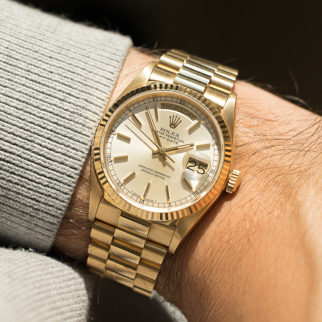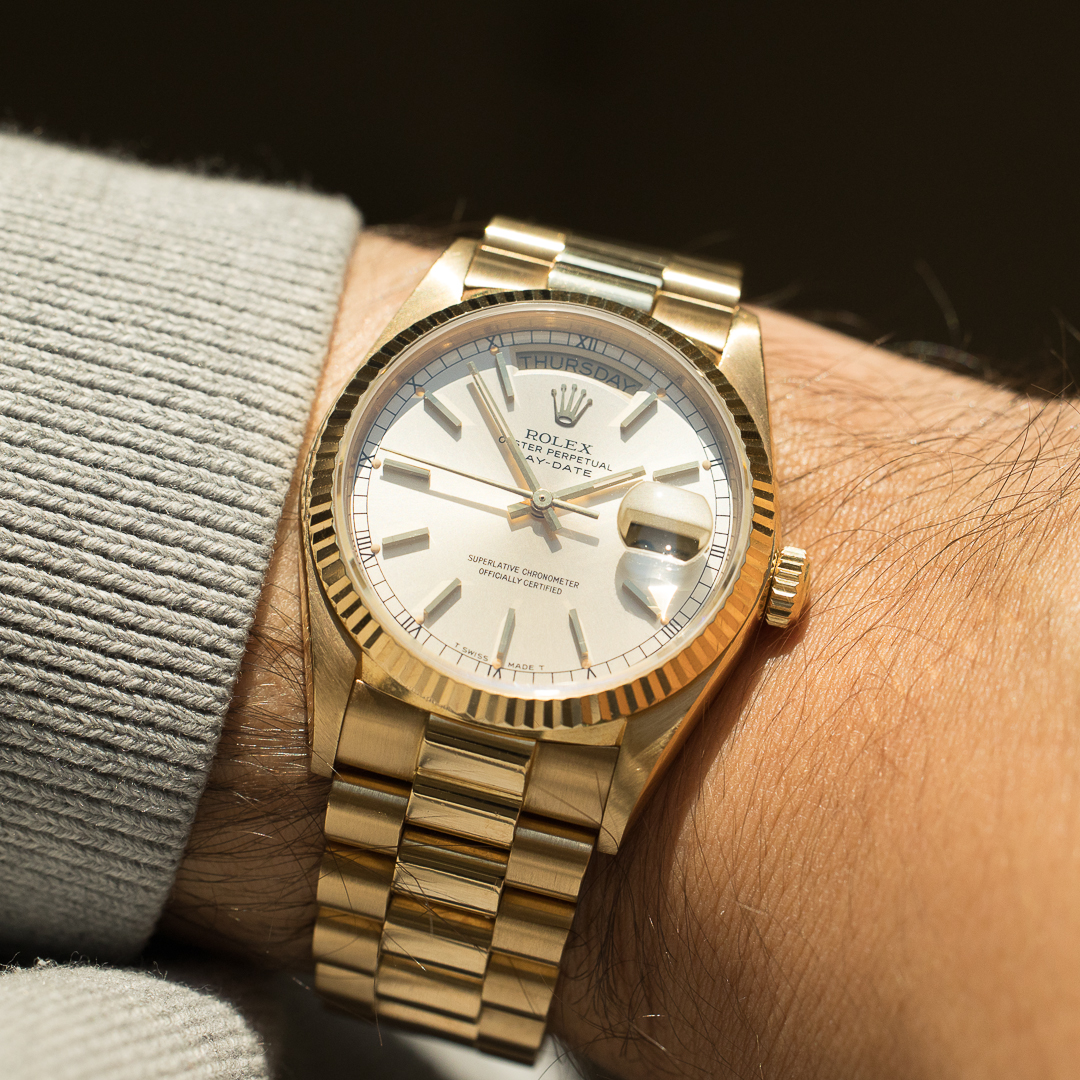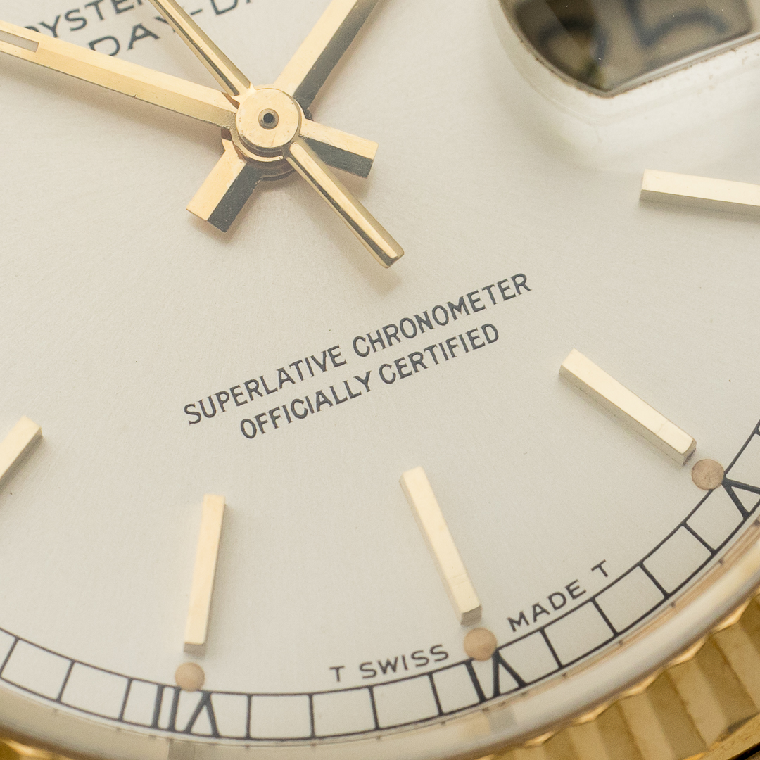The Rolex Day Date, also known as the "Rolex President", is the epitome of luxury watchmaking. This specific model, reference 18038, dates back to circa 1986. The watch is made entirely of 18-carat yellow gold. The rare and beautiful silver dial pairs beautifully with the yellow gold. And the case and bracelet kept a great overall condition.