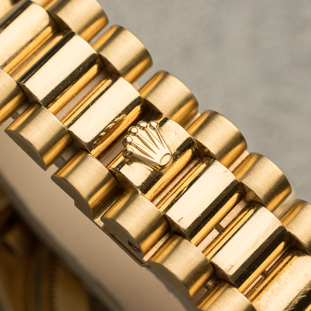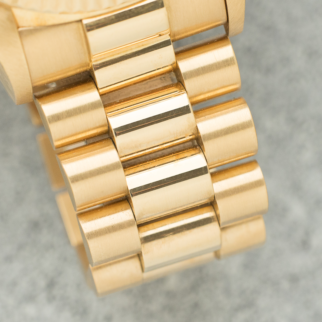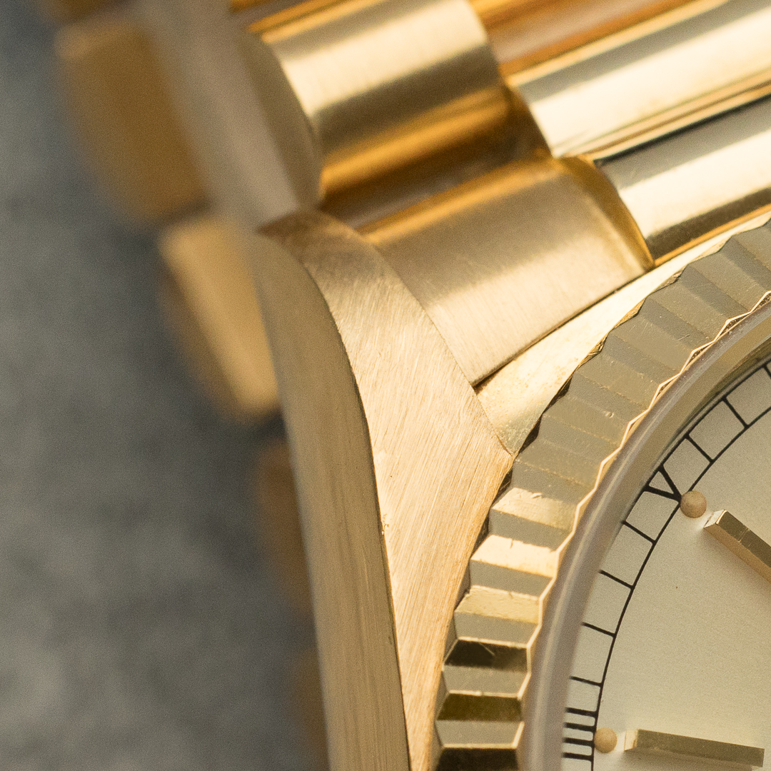 The Rolex Day Date, also known as the "Rolex President", is a legendary and prestigious model in Rolex's rich history. Unlike the so-called "sports" models, the Rolex Day Date is a pure luxury product. Always produced in white, yellow or pink gold, it is perfectly suited to daily use, thanks in particular to its day and date functions, which are all too often neglected. The 18038, the first 5-digit reference, saw the introduction of the quickset for the date, providing a practical advantage without compromising the watch's vintage aesthetic.