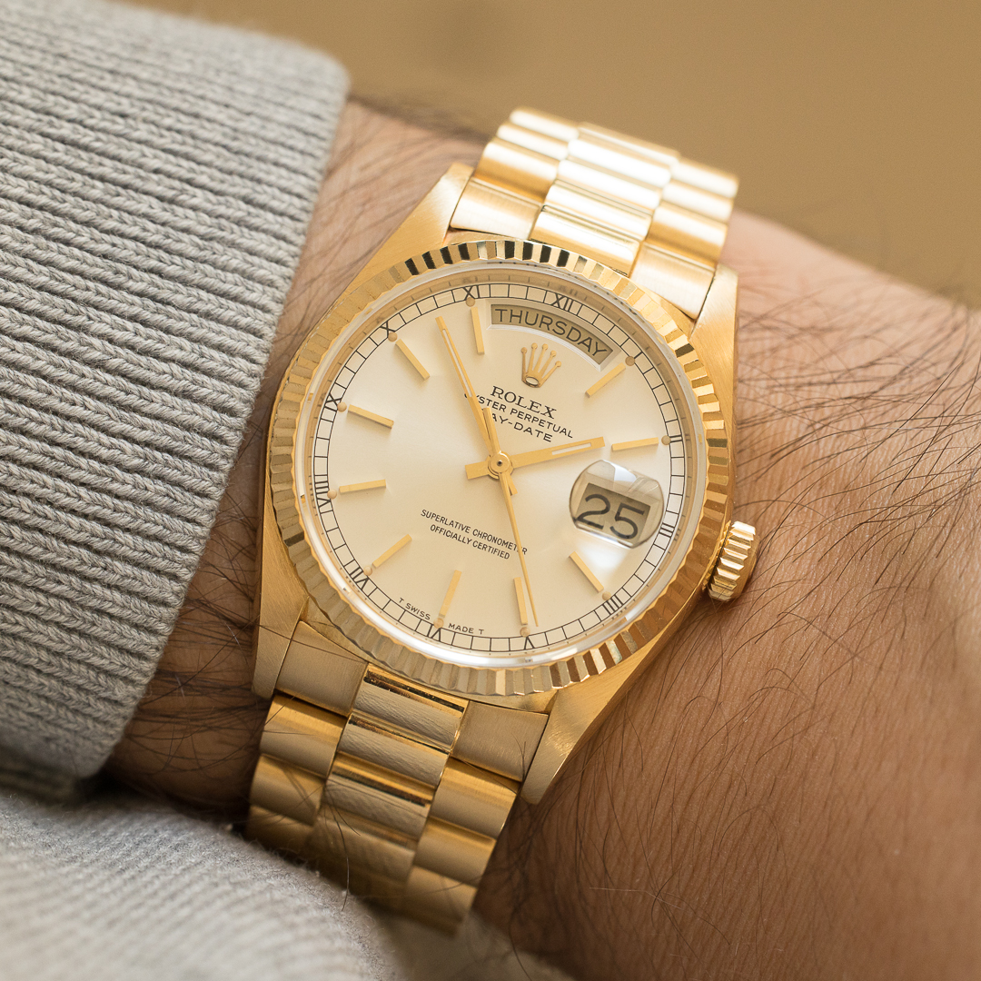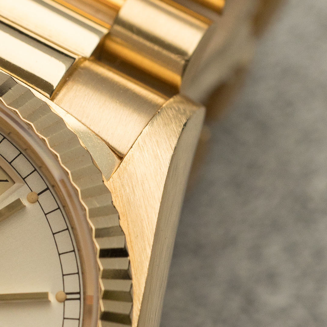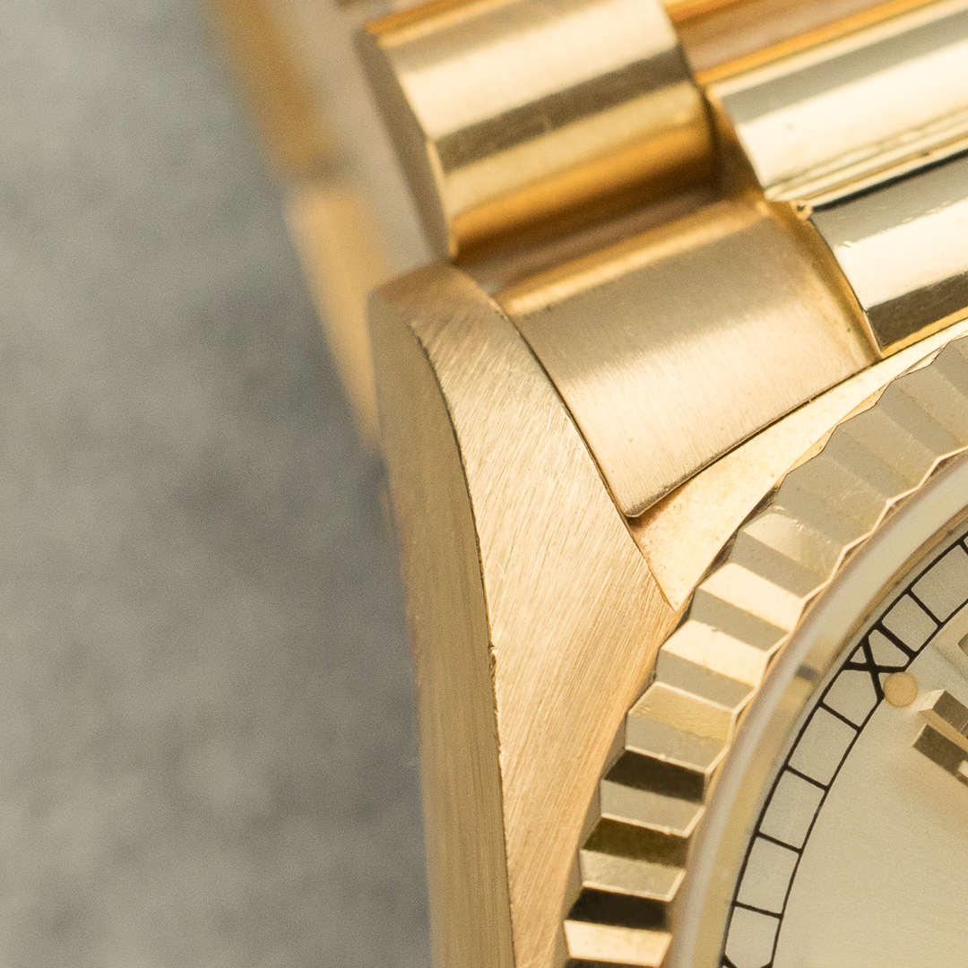 The Rolex Day Date, also known as the "Rolex President", is a legendary and prestigious model in Rolex's rich history. Unlike the so-called "sports" models, the Rolex Day Date is a pure luxury product. Always produced in white, yellow or pink gold, it is perfectly suited to daily use, thanks in particular to its day and date functions, which are all too often neglected. The 18038, the first 5-digit reference, saw the introduction of the quickset for the date, providing a practical advantage without compromising the watch's vintage aesthetic.