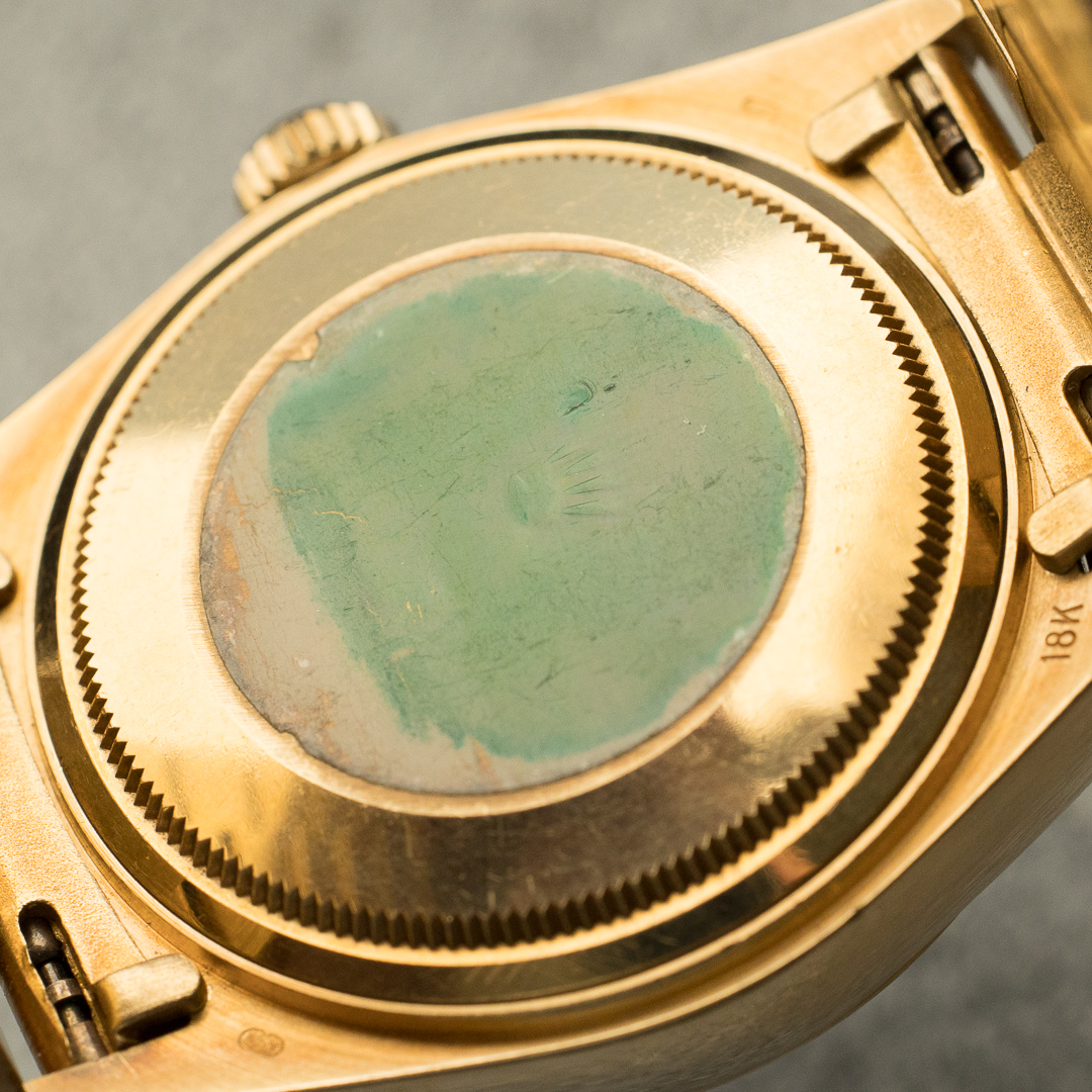 With its heavy, warm presence on the wrist, this watch is more than just a gold watch. It represents an entire body of watchmaking expertise, and in particular the excellent use of precious materials for which Rolex, among others, is renowned. This specific piece is entirely original and has kept a great overall condition, something that is quite rare on a timepiece that is almost 40 years old. Its immaculate silver dial has developed a charming patina on the indexes and hands. This rare dial is truly the eye-catching part of this watch, thanks in part to its marvellous sunburst effects. The watch comes with a spare golden tritium dial.