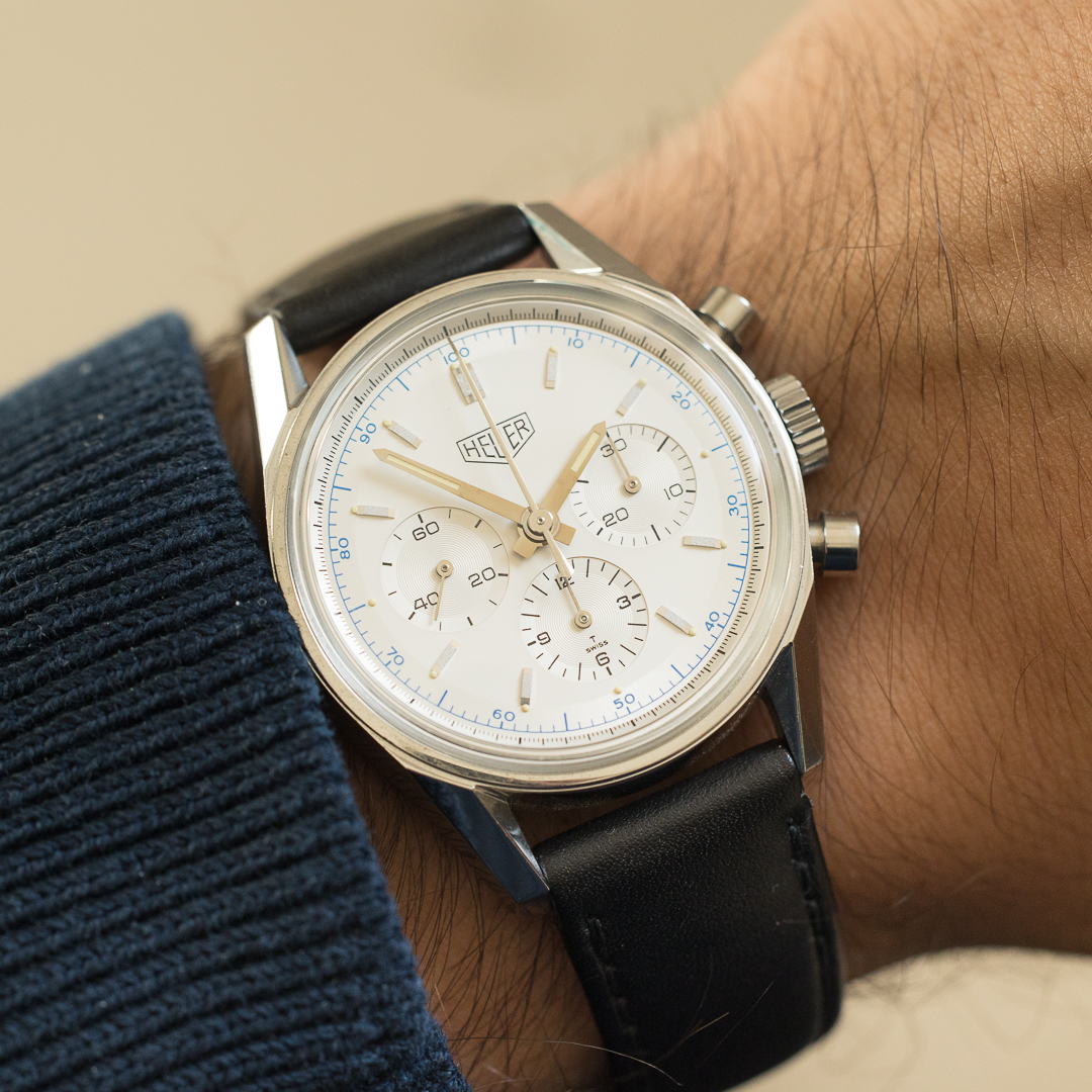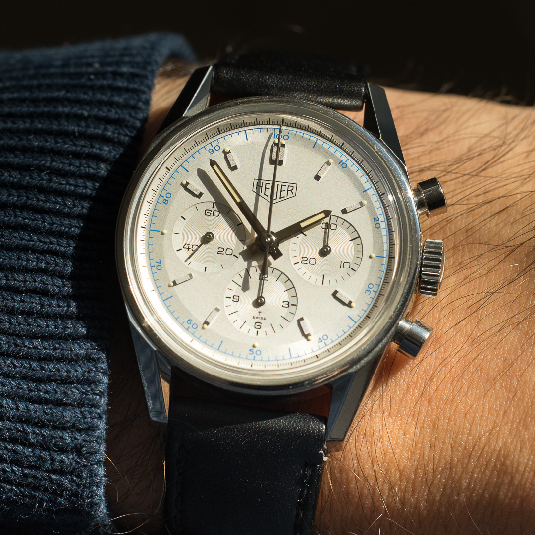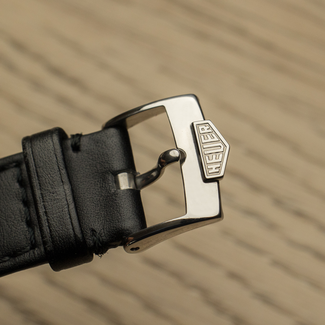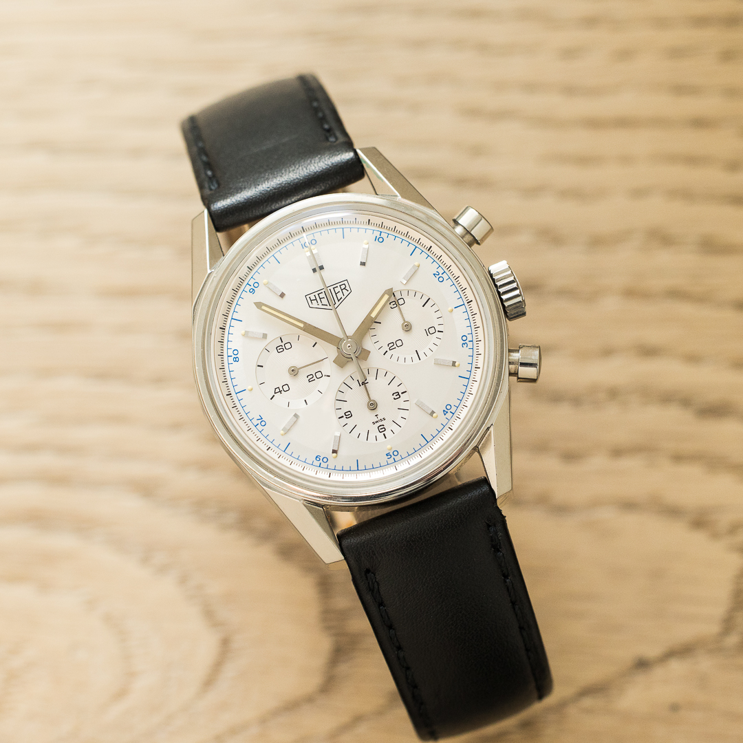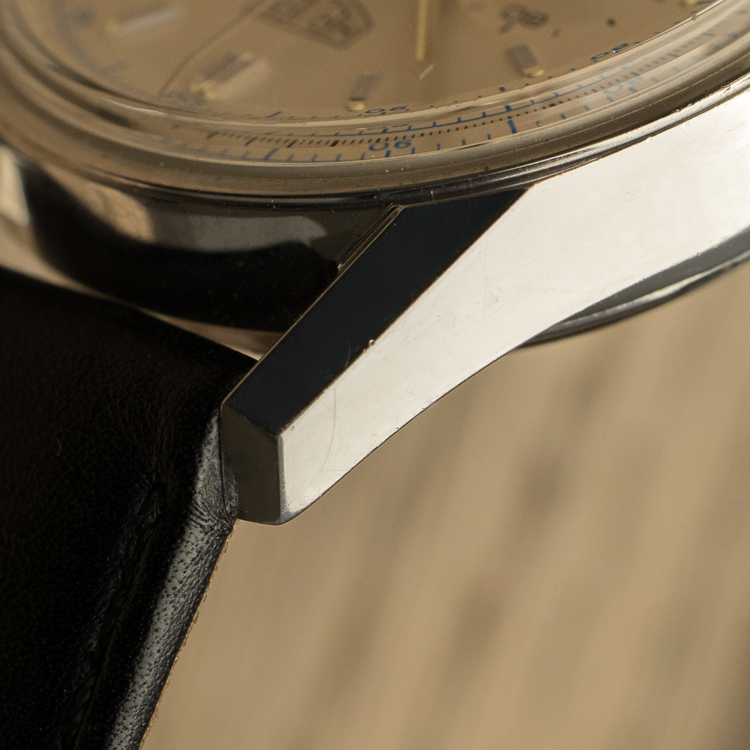 The Carrera re-edition CS3110 faithfully recreates the 1965 Carrera ref. 2447D, known for its distinctive blued decimal track. This specific example remains impeccably preserved. Its dial features a charming creamy tritium on the indexes and hands, and has retained its flawless condition. The case is in amazing condition, probably unpolished, making this the perfect neo-vintage piece for anyone looking to acquire one of the best reedition of a historically important watch.