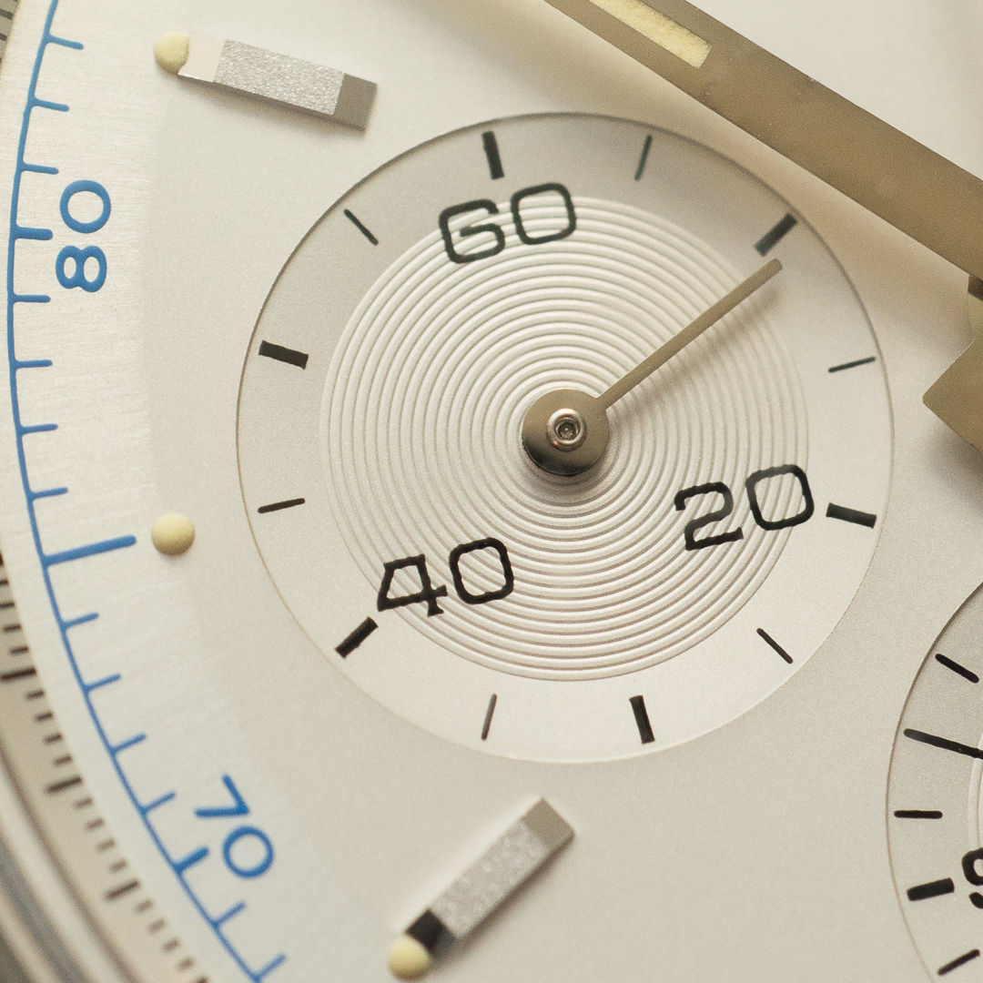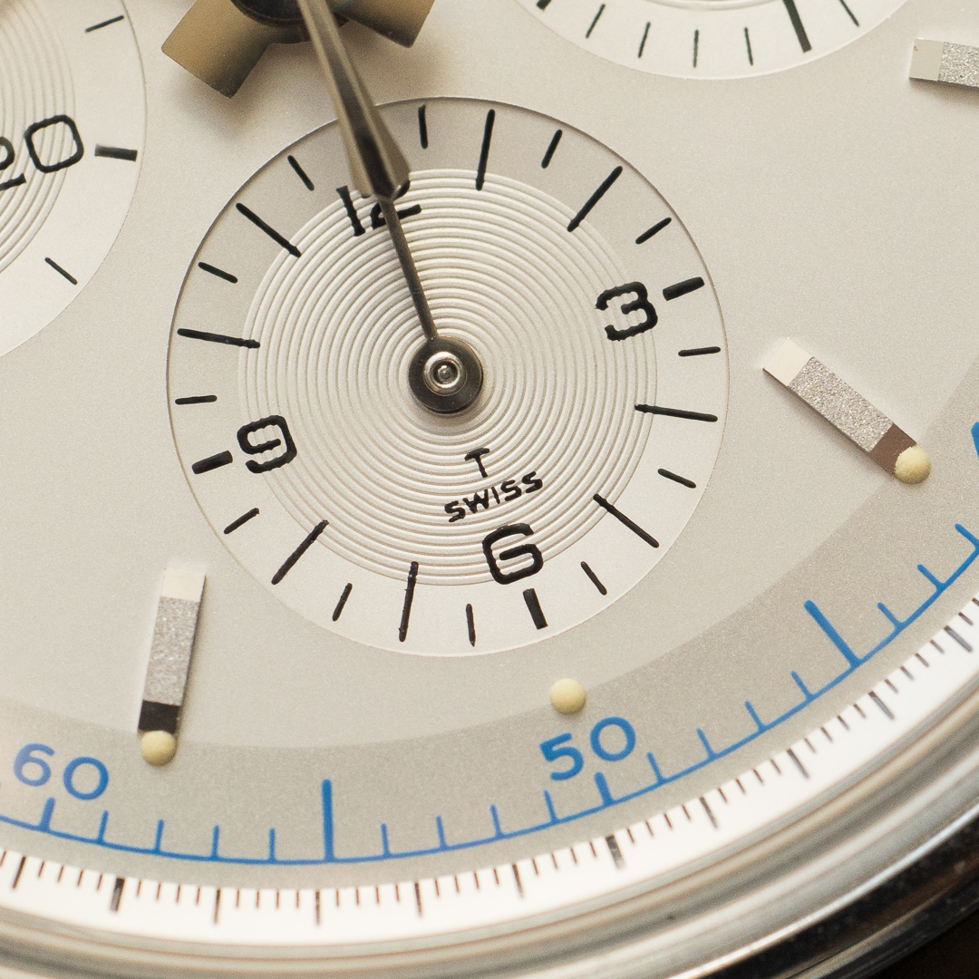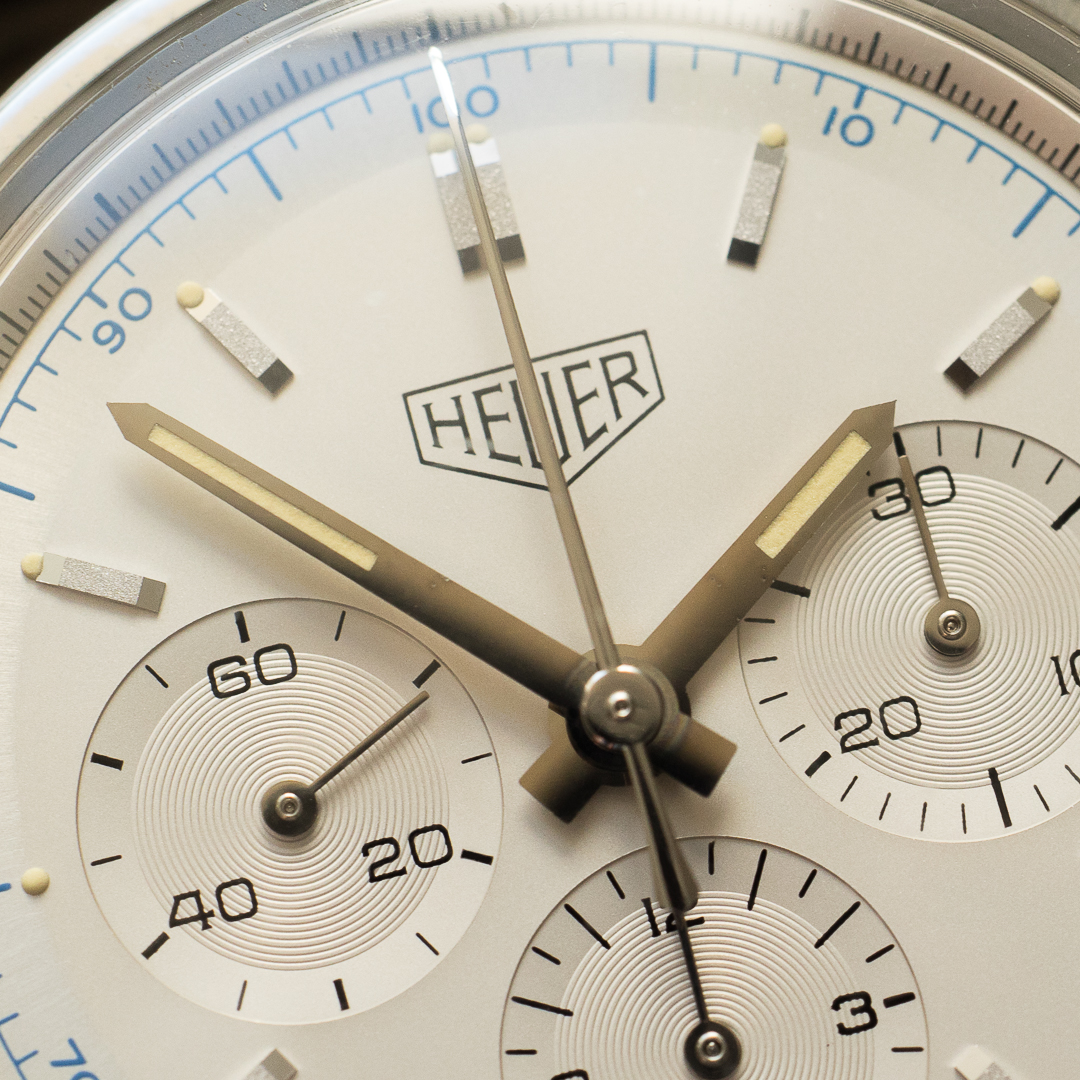 The Carrera re-edition CS3110 faithfully replicates the iconic design of the early Carrera ref. 2447D from 1965, renowned for its blue outer decimal track. Released just before TAG Heuer was acquired by LVMH, this re-edition marks a significant moment in the brand's embracing of its historical designs in the 1990s. With a polished 36mm case, Carrera lugs, and vintage-style pump pushers, it closely resembles its 1960s predecessor. Notably, it features tritium lume on the hands and hour markers, which will develop a charming patina over time, making it a highly authentic homage to the original.