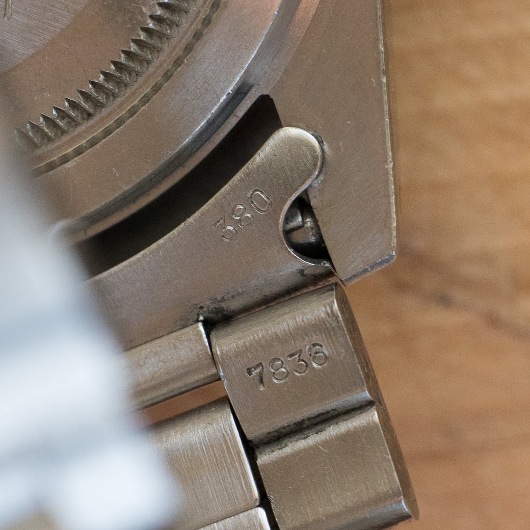 The bracelet is the folded-links Oyster bracelet, reference 7836. It is in great condition and has no stretch.